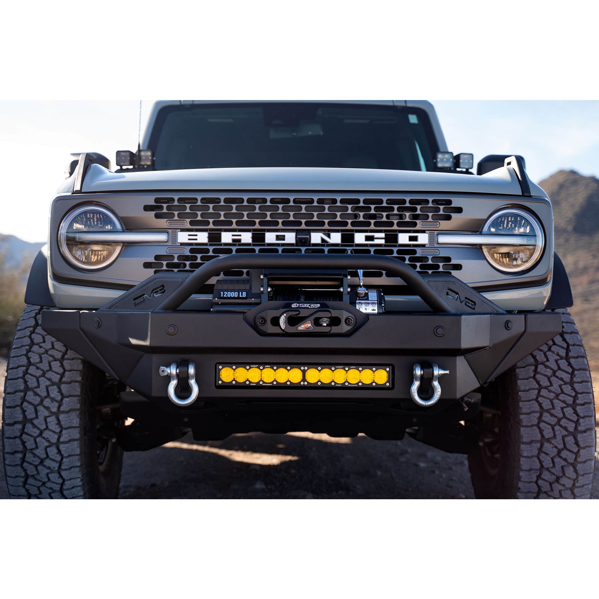 The Bronco FS-15 Series is a 2021-2022 Ford Bronco Winch-Ready Mid-Width Front Bumper, with the option to include modular wings to make it a full-width bumper. The light mount tabs on the bull bar can be oriented to mount a 13-inch light bar above or below the bull bar. Up to a 12,000 lb. winch can be mounted on top of the bumper. At the center of the bumper, either a 20-inch dual row light bar or 6 pod lights can be mounted. Two recovery mounts that take 3/4 in D-rings provide additional recovery options. This bumper is compatible with the OEM plastic & metal skid plates, and also retains the factory parking sensors.