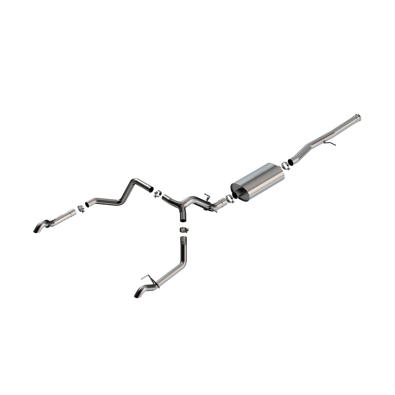 This system was designed specifically for the 6.2L Silverado 1500 ZR2 and Sierra 1500 AT4X. The 3.5" diameter Cat-Back(tm) system has dual 2.75" turn down tail pipes and features the mellow Borla(r) Touring sound level with no drone inside the vehicle. Borla(r) Cat-Back(tm) & Axle-Back exhaust systems feature patented straight-through and multi-core technology to unleash hidden horsepower. Increased exhaust velocity adds power, driving excitement, fuel economy, and the distinctive Borla(r) Sound of Power respected by motoring enthusiasts everywhere. Each system is built from premium T-304 austenitic stainless steel, superior to T-400 series knockoffs (such as 409), to give you the absolute best in performance and durability. Ultra-smooth mandrel bends ensure maximum flow & power, and precision computer numerical control (CNC) manufacturing ensures an accurate fit. Give your ZR2 or AT4X the sound it deserves, bolt on a Borla(r). Best of all, Borla(r) stands behind every system with a Million-Mile Warranty. Just what you'd expect from the world's most experienced (and most winning) exhaust brand.