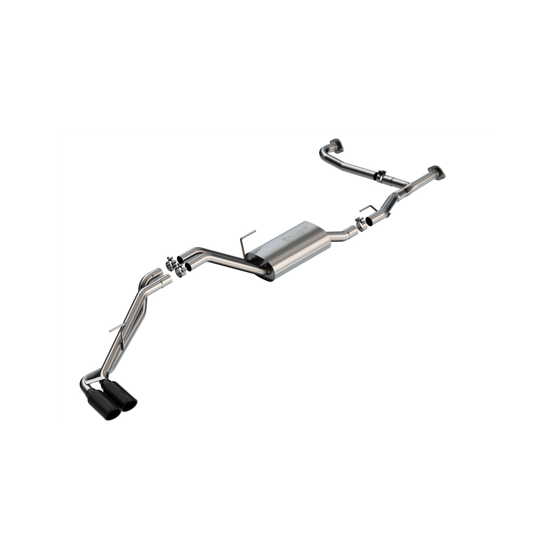 This 2.5" diameter into dual 2.25" BORLA® Cat-Back™ system was specifically designed to enhance the power and sound of the Frontier equipped with 3.8L engine. The system features the classic S-Type sound that gives you a powerful performance sound with no drone. It features 2 full Tail Pipes (Not a single tail pipe with dual tips) with single 4" round black chrome on T-304 stainless steel tips on each tail pipe and a dual side exit configuration. Using BORLA® Stainless Steel Polish p# 21461 is NOT recommended with these black chrome tips. We suggest cleaning the tips with hot water and a microfiber cloth. A system is also available with bright chrome on T-304 stainless steel tips. BORlA® Cat-Back™ & Axle-Back exhaust systems feature patented straight-through and multi-core technology to unleash hidden horsepower. Increased exhaust velocity adds power, driving excitement, fuel economy, and the distinctive BORLA® Sound of Power respected by motoring enthusiasts everywhere. Each system is built from premium, high-quality T-304 austenitic stainless steel, superior to T-400 series knockoffs (such as 409), to give you the absolute best in performance and durability. The entire system is made of T-304 stainless steel and utilizes computer numerical control (CNC) manufacturing techniques that ensure an accurate fit. All this is backed by our unsurpassed Million Mile Warranty.