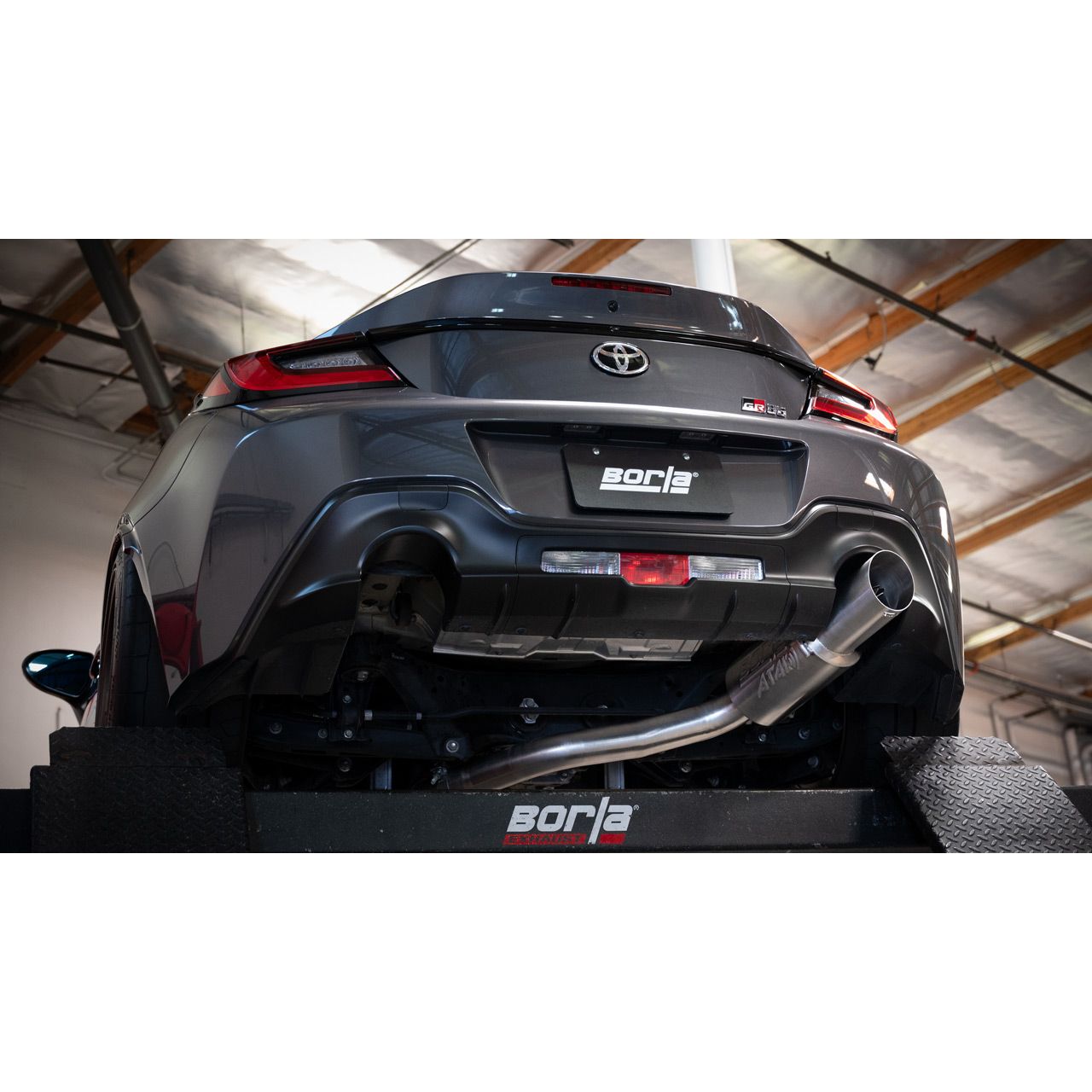 This BORLA Cat-Back™ system is designed specifically for the 2.4L engine in the BRZ and GR86. The 3" diameter single exit system features Polyphonic Harmonizer technology which utilizes patented units that contain pipes of different diameters and lengths to create multiple exhaust notes that harmonize to deliver a clean, rich, full-bodied sound and the aggressive ATAK sound with no drone in the cabin. The system exits in the rear on the passenger side and features laser welded muffler end caps for a clean appearance. Extended Polyphonic Harmonizer muffler core design exits inside the single 4.5" round brushed T-304 stainless steel tip. The tip has a laser cut BORLA logo. >BORLA Cat-Back™ and Axle-Back exhaust systems feature patented straight-through and multi-core technology designed to unleash hidden horsepower. Increased exhaust velocity adds power, driving excitement, fuel economy, and the distinctive BORLA Sound of Power respected by motoring enthusiasts everywhere. Each system is built from premium T-304 stainless steel, superior to T-400 series knockoffs (such as 409), to give you the absolute best in performance and durability. Ultra-smooth mandrel bends ensure maximum flow & power, and precision computer numerical control (CNC) manufacturing ensures an accurate fit. Best of all, BORLA stands behind every system with a Million-Mile Warranty. Just what you'd expect from the world's most experienced (and most winning) exhaust brand.