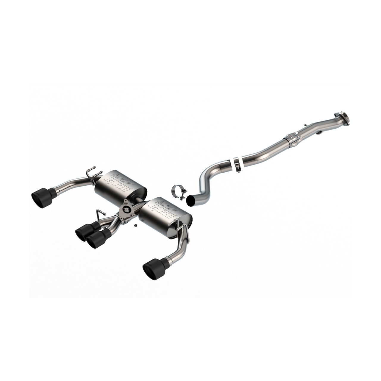 This 3" diameter Borla(r) Cat-Back(tm) system is designed specifically for the 1.6L engine in the GR Corolla. The system contains Borla(r)'s Polyphonic Harmonizer Technology which utilizes patented units that contain pipes of different diameters and lengths to create multiple exhaust notes that harmonize to deliver a clean, rich, full-bodied sound and the dual mufflers deliver the aggressive ATAK(r) sound with no drone. The system has an Active Exhaust Valve. It features 4 black coated T-304 stainless steel tips, 2) 3.5" round (center) tips and 2) 4.5" round (outer) tips. Systems with polished T-304 stainless steel tips, and carbon fiber tips are also available. Borla(r) Cat-Back(tm) & Axle-Back exhaust systems feature patented straight-through and multi-core technology to unleash hidden horsepower. Increased exhaust velocity adds power, driving excitement, fuel economy, and the distinctive Borla(r) Sound of Power respected by motoring enthusiasts everywhere. Each system is built from premium, high-quality T-304 austenitic stainless steel, superior to T-400 series knockoffs (such as 409), to give you the absolute best in performance and durability. Ultra-smooth mandrel bends ensure maximum flow & power, and precision computer numerical control (CNC) manufacturing ensures an accurate fit. Best of all, Borla(r) stands behind every system with a Million-Mile Warranty. Just what you'd expect from the world's most experienced (and most winning) exhaust brand. Give your GR Corolla the power and sound it deserves, bolt on a Borla(r).