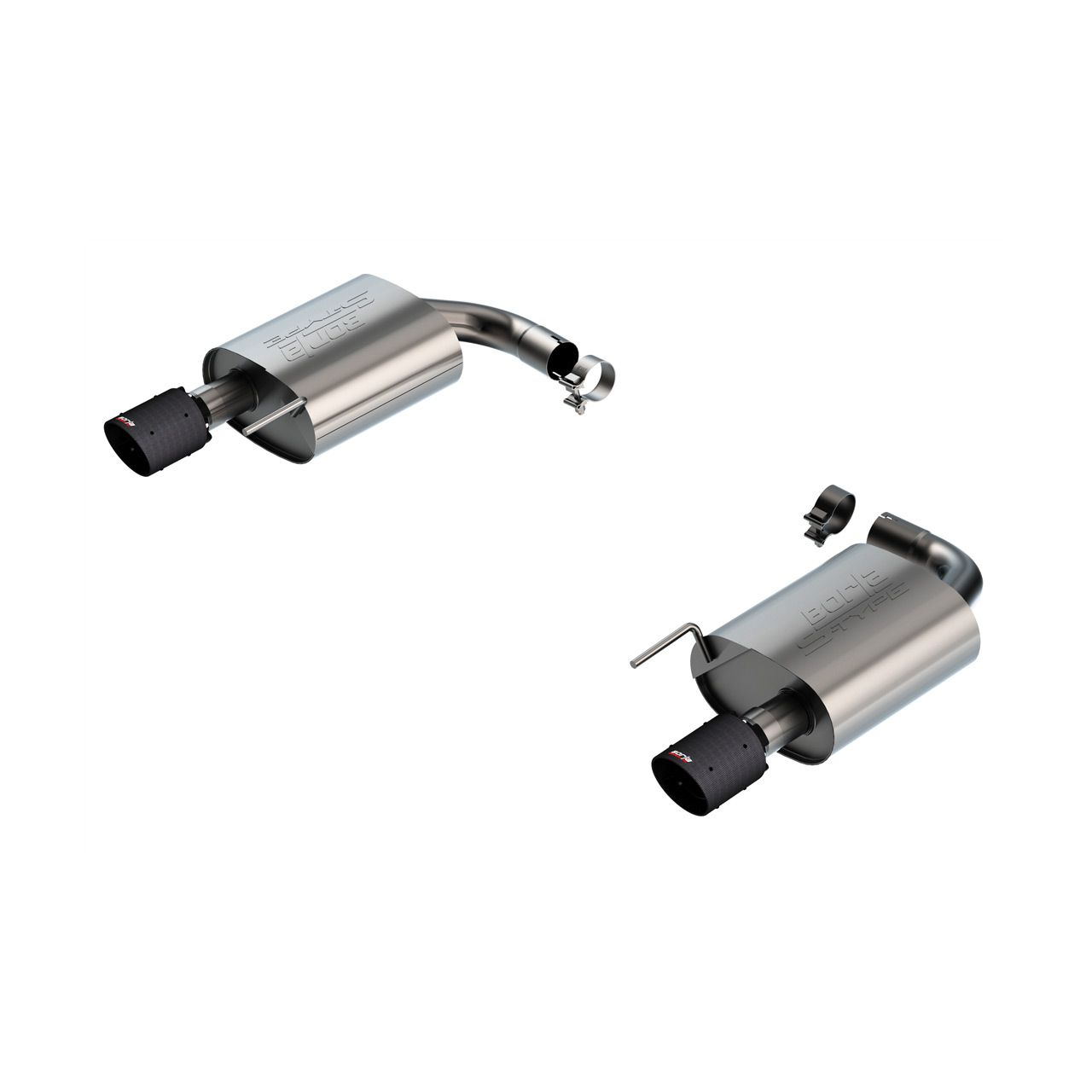 This 2.5" diameter Borla(r) Axle-Back system is designed for use on EcoBoost cars WITHOUT the Active Exhaust feature. It features the classic S-Type sound with no drone inside the vehicle and single 4" round carbon fiber with black anodized center tips on each muffler assembly. Systems with bright chrome on T-304 stainless steel tips, and black chrome on T-304 stainless steel are also available. Borla(r) Cat-Back(tm) and Axle-Back exhaust systems feature patented straight-through and multi-core technology designed to unleash hidden horsepower. Increased exhaust velocity adds power, driving excitement, fuel economy, and the distinctive Borla(r) Sound of Power respected by motoring enthusiasts everywhere. Each system is built from premium T-304 stainless steel, superior to T-400 series knockoffs (such as 409), to give you the absolute best in performance and durability. Ultra-smooth mandrel bends ensure maximum flow & power, and precision computer numerical control (CNC) manufacturing ensures an accurate fit. Best of all, Borla(r) stands behind every system with a Million-Mile Warranty. Just what you'd expect from the world's most experienced (and most winning) exhaust brand.