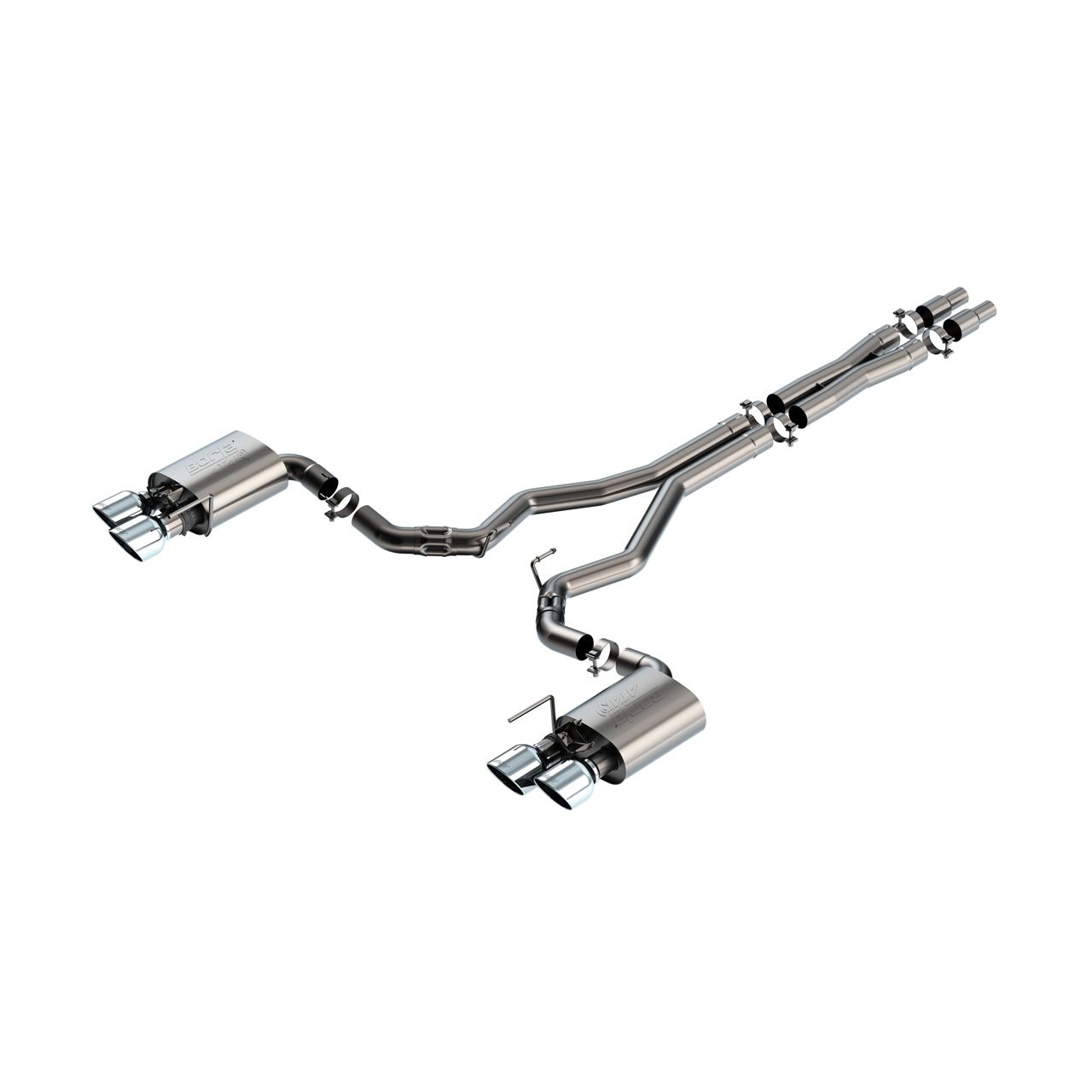 This Borla(r) Cat-Back(tm) system was designed specifically for the Mustang Dark Horse. 3" diameter True Dual system for high flow. System features a merge X-Pipe for increased performance and improved sound. System has Active Exhaust valves. System features Borla(r) 's Polyphonic Exhaust Harmonizer which utilizes patented units that contain pipes of different diameters and lengths to create multiple exhaust notes that harmonize to deliver a clean, rich, full-bodied sound. This system features the aggressive ATAK(r) sound with no drone inside the vehicle and 5" bright chrome on T-304 stainless steel tips. Systems with black chrome on T-304 stainless steel tips, and carbon fiber tips are also available. Borla(r) Cat-Back(tm) and Axle-Back multi-core technology is designed to unleash hidden horsepower. Increased exhaust velocity adds power, driving excitement, fuel economy, and the distinctive Borla(r) Sound of Power respected by motoring enthusiasts everywhere. Each system is built from premium T-304 stainless steel, superior to T-400 series knockoffs (such as 409), to give you the absolute best in performance and durability. Ultra-smooth mandrel bends ensure maximum flow & power, and precision computer numerical control (CNC) manufacturing ensures an accurate fit Best of all, Borla(r) stands behind every system with a Million-Mile Warranty. Just what you'd expect from the world's most experienced (and most winning) exhaust brand.