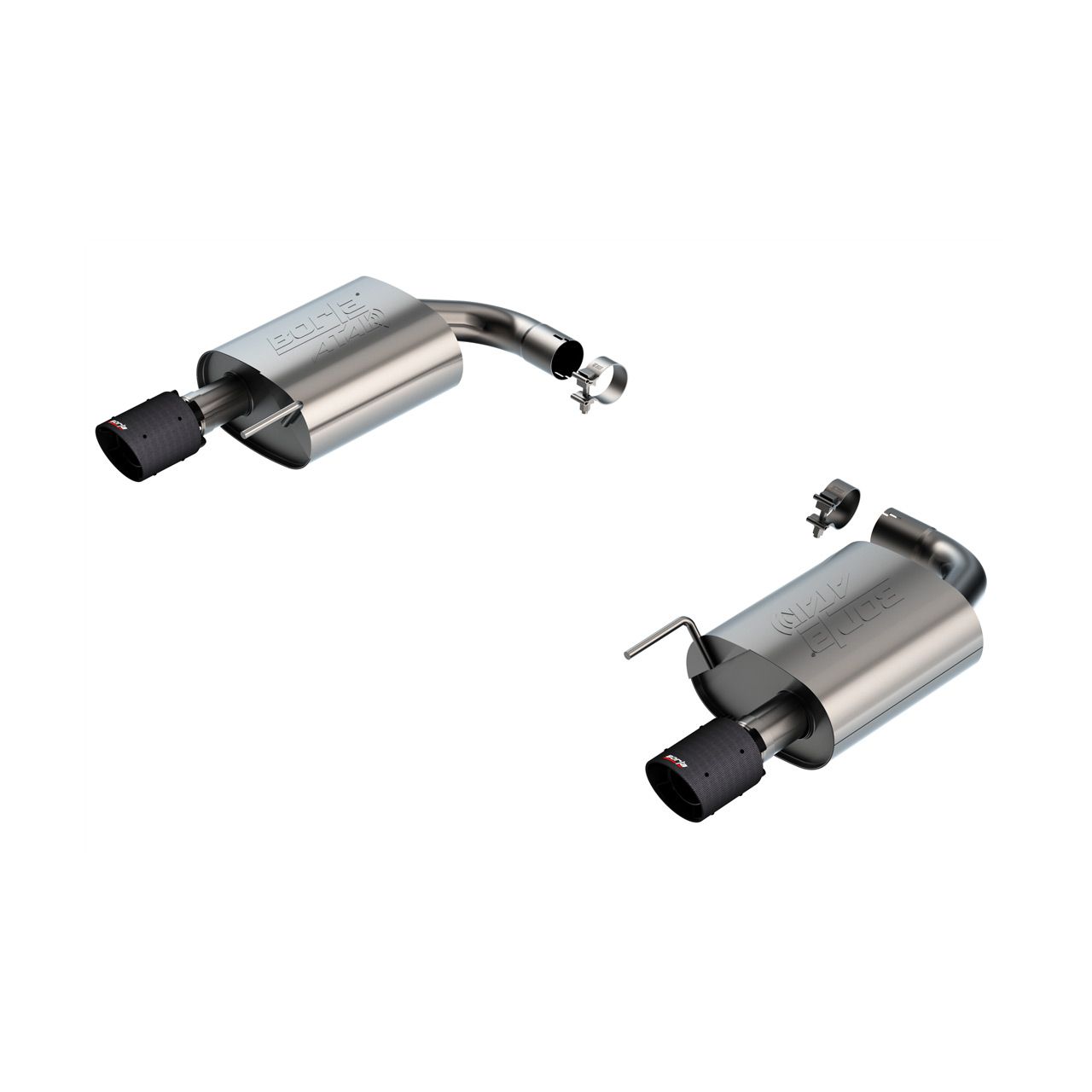 This 2.5" diameter Borla(r) Axle-Back exhaust system is designed to fit the 5.0L Mustang GT that is NOT equipped with Active Valve Performance Exhaust. Muffler contains Polyphonic Harmonizer technology which utilizes patented units that contain pipes of different diameters and lengths to create multiple exhaust notes that harmonize to deliver a clean, rich, full-bodied sound. It features 4" carbon fiber with black anodized center tips and the aggressive ATAK(r) sound level with no drone inside the vehicle. Systems with bright chrome on T-304 stainless steel tips, and black chrome on T-304 stainless steel tips are also available. It fits both the coupe and convertible models. The straight-through and patented multi-core technology is designed to unleash hidden horsepower. Increased exhaust velocity adds power, driving excitement, fuel economy, and the distinctive Borla(r) Sound of Power respected by motoring enthusiasts everywhere. Each system is built from premium T-304 stainless steel, superior to T-400 series knockoffs (such as 409), to give you the absolute best in performance and durability. Ultra-smooth mandrel bends ensure maximum flow & power, and precision computer numerical control (CNC) manufacturing ensures an accurate fit. Best of all, Borla(r) stands behind every system with a Million-Mile Warranty. Just what you'd expect from the world's most experienced (and most winning) exhaust brand.