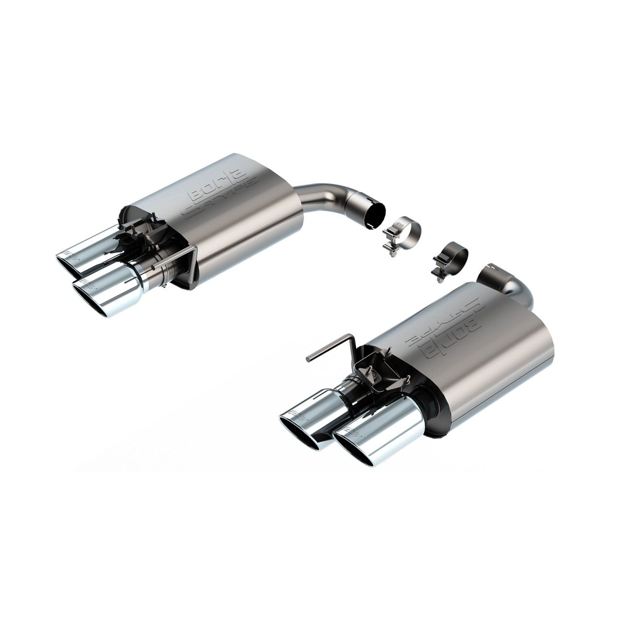 This 2.5" diameter Borla(r) Axle-Back exhaust system is designed to fit the 5.0L Mustang GT that is equipped with Active Valve Performance Exhaust. Muffler contains Polyphonic Harmonizer technology which utilizes patented units that contain pipes of different diameters and lengths to create multiple exhaust notes that harmonize to deliver a clean, rich, full-bodied sound. It features 4" bright chrome on T-304 stainless steel tips and the classic S-Type sound level with no drone inside the vehicle. Systems with black chrome on T-304 stainless steel tips, and carbon fiber tips are also available. It fits both the coupe and convertible models. The straight-through and patented multi-core technology is designed to unleash hidden horsepower. Increased exhaust velocity adds power, driving excitement, fuel economy, and the distinctive Borla(r) Sound of Power respected by motoring enthusiasts everywhere. Each system is built from premium T-304 stainless steel, superior to T-400 series knockoffs (such as 409), to give you the absolute best in performance and durability. Ultra-smooth mandrel bends ensure maximum flow & power, and precision computer numerical control (CNC) manufacturing ensures an accurate fit. Best of all, Borla(r) stands behind every system with a Million-Mile Warranty. Just what you'd expect from the world's most experienced (and most winning) exhaust brand.