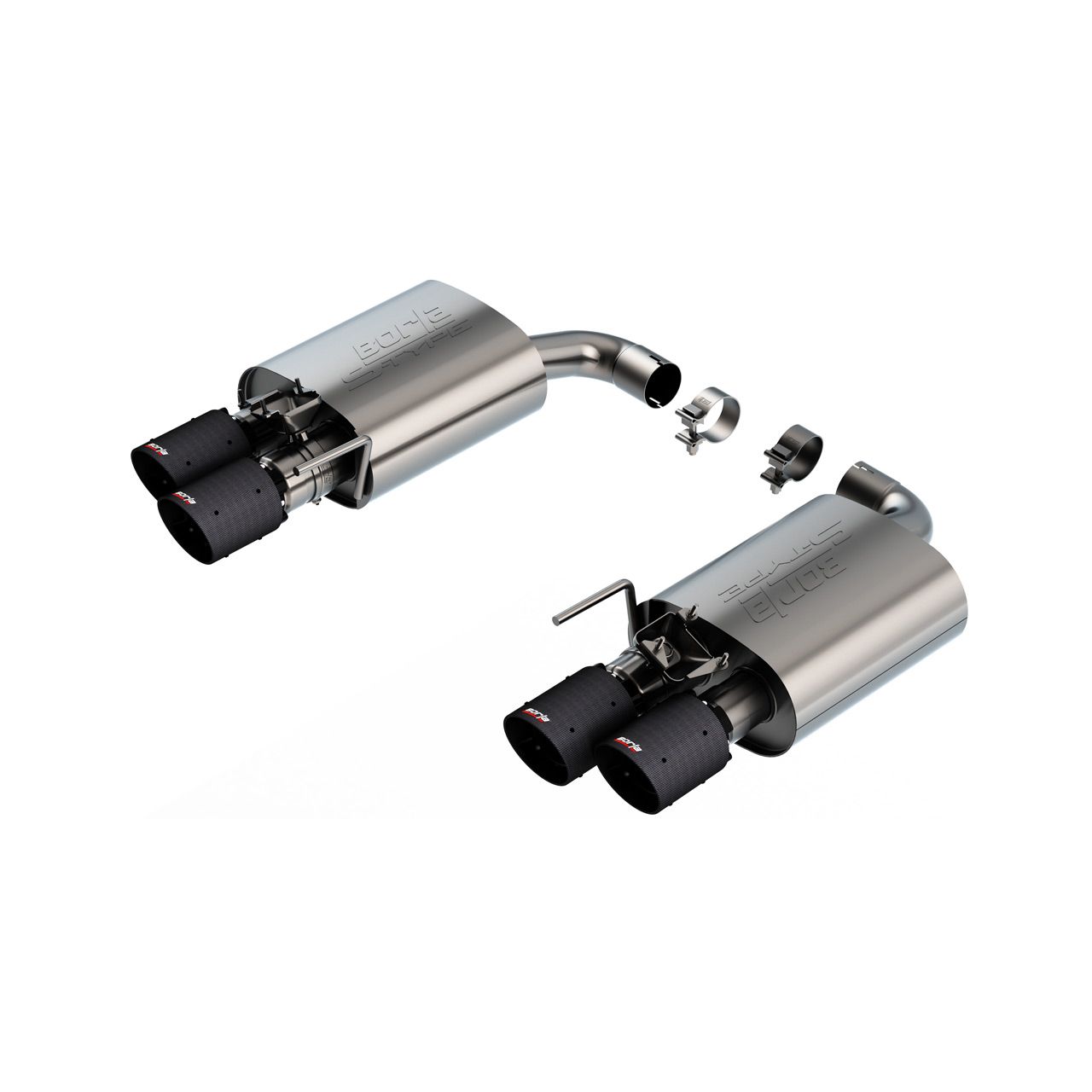 This 2.5" diameter Borla(r) Axle-Back exhaust system is designed to fit the 5.0L Mustang GT that is equipped with Active Valve Performance Exhaust. Muffler contains Polyphonic Harmonizer technology which utilizes patented units that contain pipes of different diameters and lengths to create multiple exhaust notes that harmonize to deliver a clean, rich, full-bodied sound. It features 4" carbon fiber tips with black anodized centers and the classic S-Type sound level with no drone inside the vehicle. Systems with bright chrome on T-304 stainless steel, and black chrome on T-304 stainless steel are also available. It fits both the coupe and convertible models. The straight-through and patented multi-core technology is designed to unleash hidden horsepower. Increased exhaust velocity adds power, driving excitement, fuel economy, and the distinctive Borla(r) Sound of Power respected by motoring enthusiasts everywhere. Each system is built from premium T-304 stainless steel, superior to T-400 series knockoffs (such as 409), to give you the absolute best in performance and durability. Ultra-smooth mandrel bends ensure maximum flow & power, and precision computer numerical control (CNC) manufacturing ensures an accurate fit. Best of all, Borla(r) stands behind every system with a Million-Mile Warranty. Just what you'd expect from the world's most experienced (and most winning) exhaust brand.