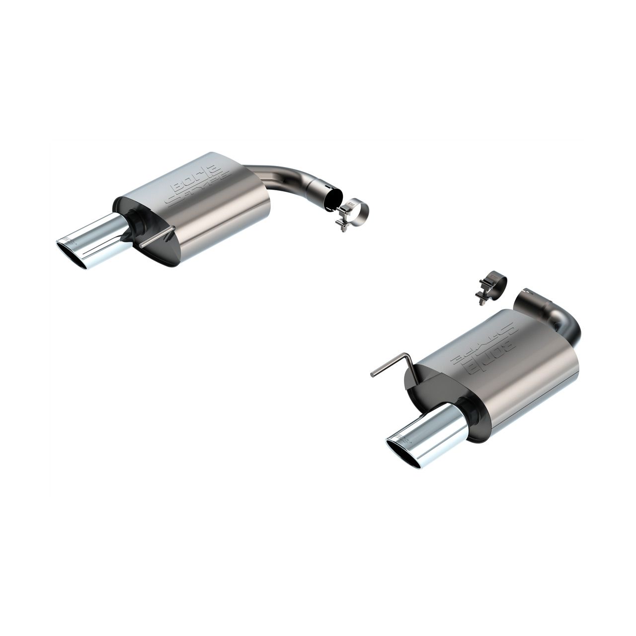 This 2.5" diameter Borla(r) Axle-Back exhaust system is designed to fit the 5.0L Mustang GT that is NOT equipped with Active Exhaust. It features 4" bright chrome on T-304 stainless steel tips and the classic S-Type sound level with no drone inside the vehicle. Systems with black chrome on T-304 stainless steel tips, and carbon fiber tips are also available. It fits both the coupe and convertible models. The straight-through and patented multi-core technology is designed to unleash hidden horsepower. Increased exhaust velocity adds power, driving excitement, fuel economy, and the distinctive Borla(r) Sound of Power respected by motoring enthusiasts everywhere. Each system is built from premium T-304 stainless steel, superior to T-400 series knockoffs (such as 409), to give you the absolute best in performance and durability. Ultra-smooth mandrel bends ensure maximum flow & power, and precision computer numerical control (CNC) manufacturing ensures an accurate fit. Best of all, Borla(r) stands behind every system with a Million-Mile Warranty. Just what you'd expect from the world's most experienced (and most winning) exhaust brand.