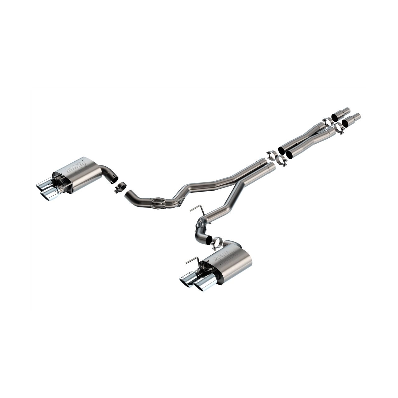 This 3" diameter True Dual Borla(r) Cat-Back(tm) system features a merge X-Pipe for increased performance and improved sound. This system contains active valves that retain the Active Exhaust functionality. Muffler contains Polyphonic Harmonizer technology which utilizes patented units that contain pipes of different diameters and lengths to create multiple exhaust notes that harmonize to deliver a clean, rich, full-bodied sound. It features the aggressive ATAK(r) sound with no drone inside the vehicle and 4" bright chrome on T-304 stainless steel tips. Systems with black chrome on T-304 stainless steel tips, and carbon fiber tips are also available. Borla(r) Cat-Back(tm) and Axle-Back exhaust systems feature patented straight-through and multi-core technology designed to unleash hidden horsepower. Increased exhaust velocity adds power, driving excitement, fuel economy, and the distinctive Borla(r) Sound of Power respected by motoring enthusiasts everywhere. Each system is built from premium T-304 stainless steel, superior to T-400 series knockoffs (such as 409), to give you the absolute best in performance and durability. Ultra-smooth mandrel bends ensure maximum flow & power, and precision computer numerical control (CNC) manufacturing ensures an accurate fit. Best of all, Borla(r) stands behind every system with a Million-Mile Warranty. Just what you'd expect from the world's most experienced (and most winning) exhaust brand.