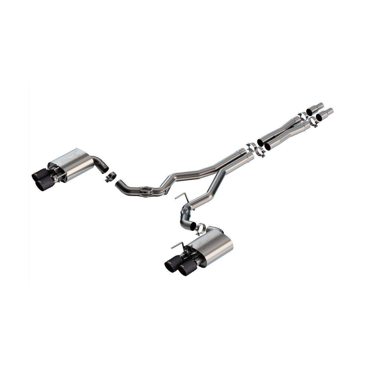 This 3" diameter True Dual Borla(r) Cat-Back(tm) system features a merge X-Pipe for increased performance and improved sound. This exhaust system contains active valves that retain the Active Exhaust functionality. Muffler contains Polyphonic Harmonizer technology which utilizes patented units that contain pipes of different diameters and lengths to create multiple exhaust notes that harmonize to deliver a clean, rich, full-bodied sound. It features the aggressive ATAK(r) sound with no drone inside the vehicle and 4" carbon fiber tips with black anodized centers. Systems with bright chrome on T-304 stainless steel tips, and black chrome on T-304 stainless steel tips are also available. Borla(r) Cat-Back(tm) and Axle-Back exhaust systems feature patented straight-through and multi-core technology designed to unleash hidden horsepower. Increased exhaust velocity adds power, driving excitement, fuel economy, and the distinctive Borla(r) Sound of Power respected by motoring enthusiasts everywhere. Each system is built from premium T-304 stainless steel, superior to T-400 series knockoffs (such as 409), to give you the absolute best in performance and durability. Ultra-smooth mandrel bends ensure maximum flow & power, and precision computer numerical control (CNC) manufacturing ensures an accurate fit. Best of all, Borla(r) stands behind every system with a Million-Mile Warranty. Just what you'd expect from the world's most experienced (and most winning) exhaust brand.