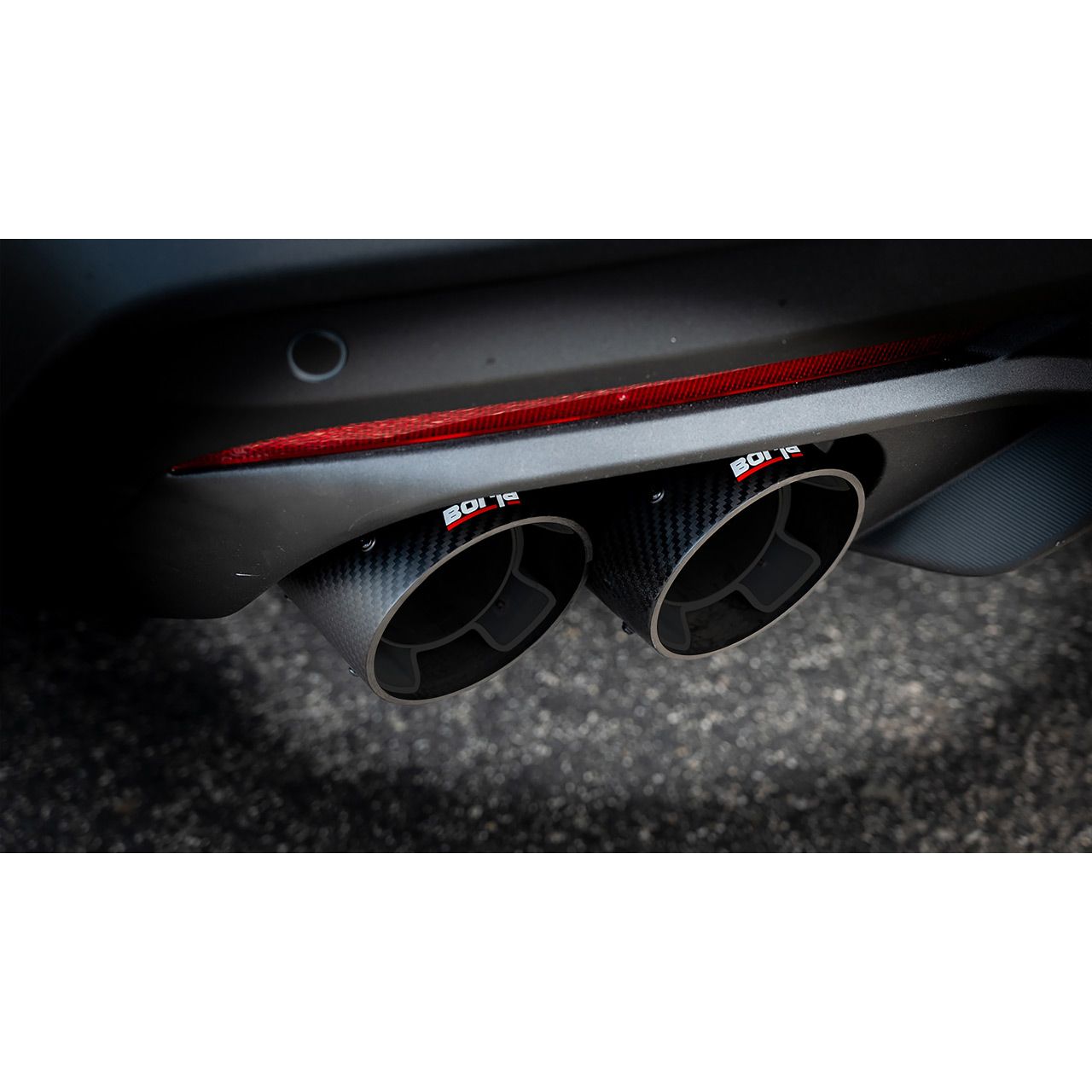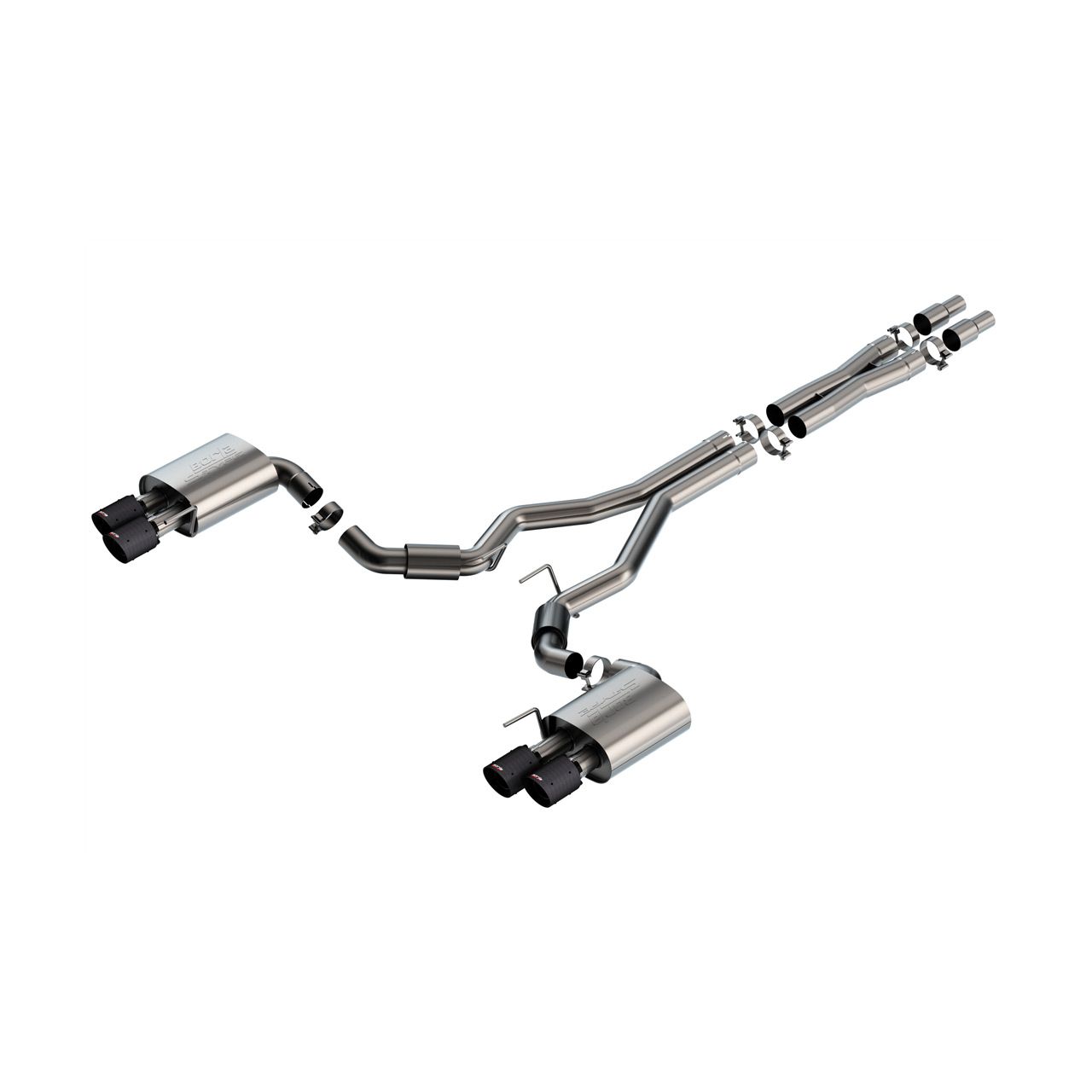 This 3" diameter True Dual Quad tip Borla(r) Cat-Back(tm) system features a merge X-Pipe for increased performance and improved sound. This system features the classic S-Type sound with no drone inside the vehicle and 4" carbon fiber tips, and is for vehicles WITHOUT the Active Exhaust feature. Systems with bright chrome on T-304 stainless steel tips, and black chrome on T-304 stainless steel tips are also available. If your car has 1 tip on each muffler and you want to upgrade it to 2 tips on each muffler (also know as quad tips), this is the system for you. It is designed to work with the quad tip (2 tips per muffler) O.E. Ford Valance ONLY. If you want to install this system on a vehicle that came with one tip per muffler you will need to buy and install a different valance. Ford quad tip valance part numbers: With Parking Sensors = PR3Z-17F828-DA, Without Parking Sensors = PR3Z-17F828-CA. Borla(r) Cat-Back(tm) and Axle-Back exhaust systems feature patented straight-through and multi-core technology designed to unleash hidden horsepower. Increased exhaust velocity adds power, driving excitement, fuel economy, and the distinctive Borla(r) Sound of Power respected by motoring enthusiasts everywhere. Each system is built from premium T-304 stainless steel, superior to T-400 series knockoffs (such as 409), to give you the absolute best in performance and durability. Ultra-smooth mandrel bends ensure maximum flow & power, and precision computer numerical control (CNC) manufacturing ensures an accurate fit. Best of all, Borla(r) stands behind every system with a Million-Mile Warranty. Just what you'd expect from the world's most experienced (and most winning) exhaust brand.