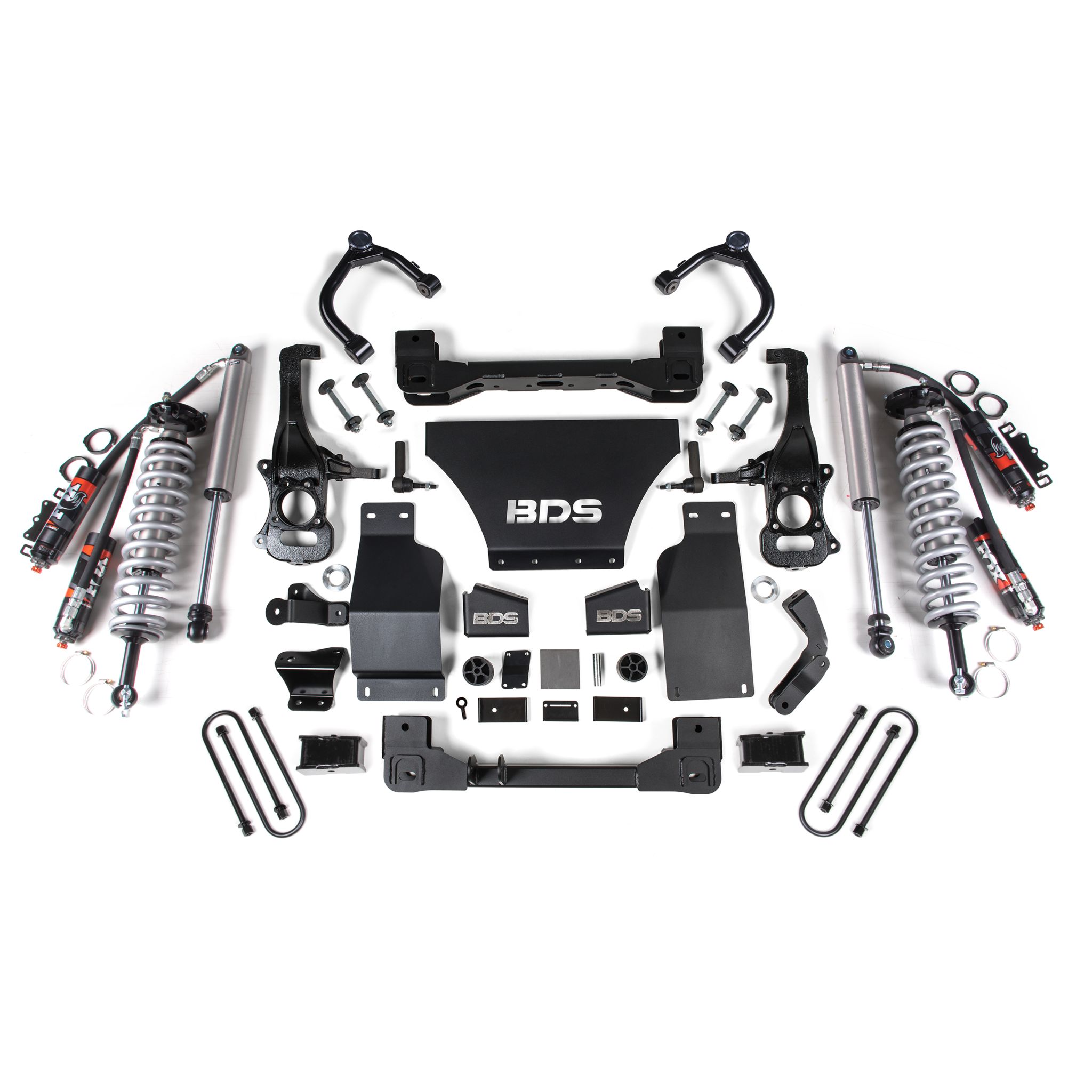 <p>This kit takes advantage of BDS's tried and true high-clearance design for improved ground clearance, strength, and offroad protection while correcting suspension and steering geometry for great on-road handling characteristics. Up front, the kit utilizes FOX 2.5 Performance Elite coil-over shocks, high-arched 1/4-inch thick steel crossmembers along with a multipiece differential relocation brackets and heavy duty skid plates built for offroad protection. Steering geometry is corrected at the new taller ride height with CNC-machined ductile iron steering knuckles and replacement tie rod ends allowing for ESC system compatibility. These combined with the provided sway bar drops, bump stop extensions, brake line brackets, CV spacers, supplied hardware and more provide a comprehensive front suspension lift ready for whatever you throw at it.</p>