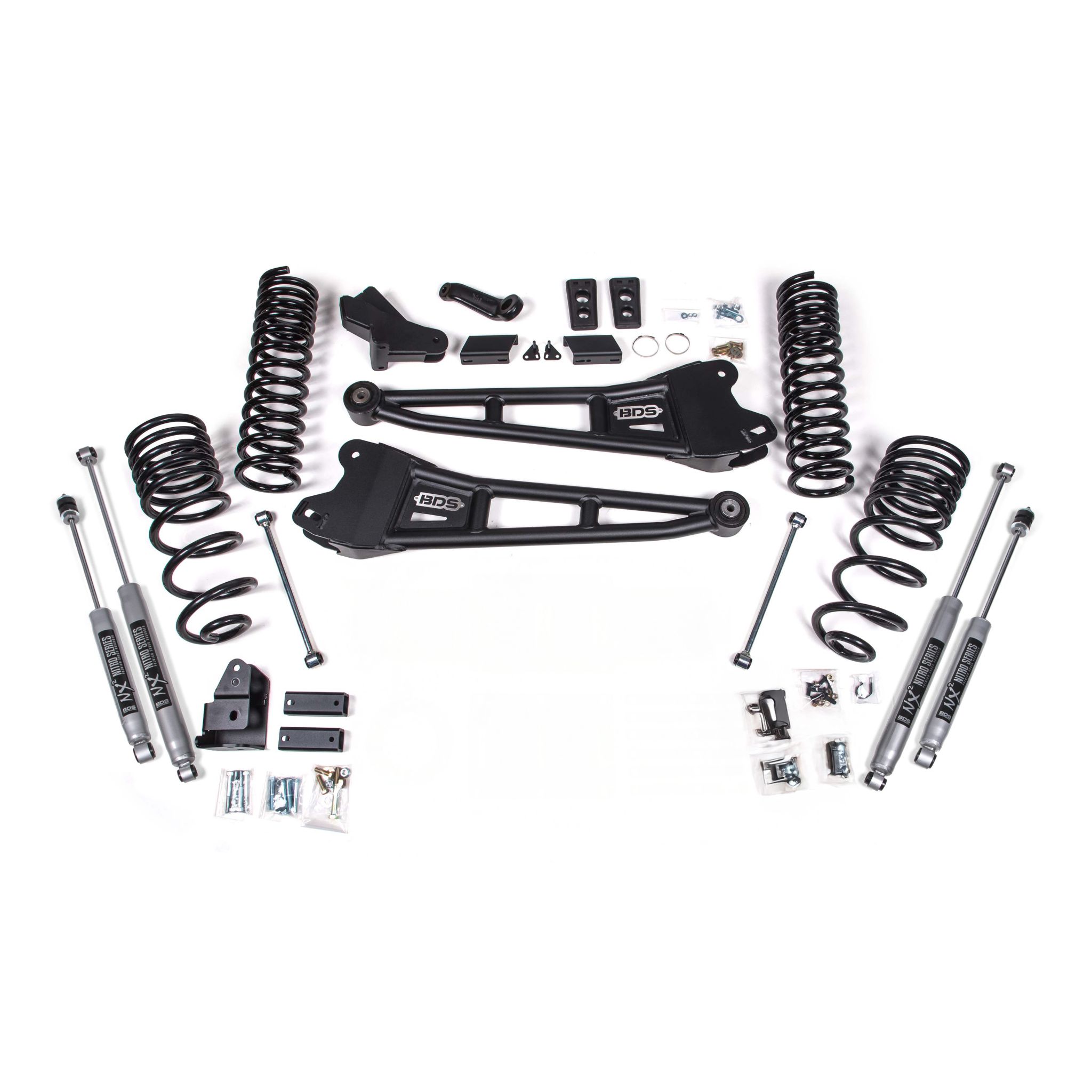 Backed by the BDS No Fine Print Warranty—if you break it, BDS will replace it. No questions asked.</p><h3>HD Radius Arms</h3><p>In place of the factory stamped steel radius arms BDS supplies a pair of high-strength tubular radius arms. These arms mount into the factory location and offer caster adjustment for a wide range of lift heights along with an OE-style rubber bushing at the frame mount for smooth, quiet, service-free operation.</p><h3>Pro-Ride Coil Springs</h3><p>A pair of full-length, diesel-specific, progressive rate Pro-Ride coil springs are supplied to provide the correct lift height and smooth, predictable ride across various terrains. Manufactured from high tensile steel, our direct OE replacement coil springs are engineered with properly sized wire diameter. This results in maximum reliability without premature coil bind.</p>