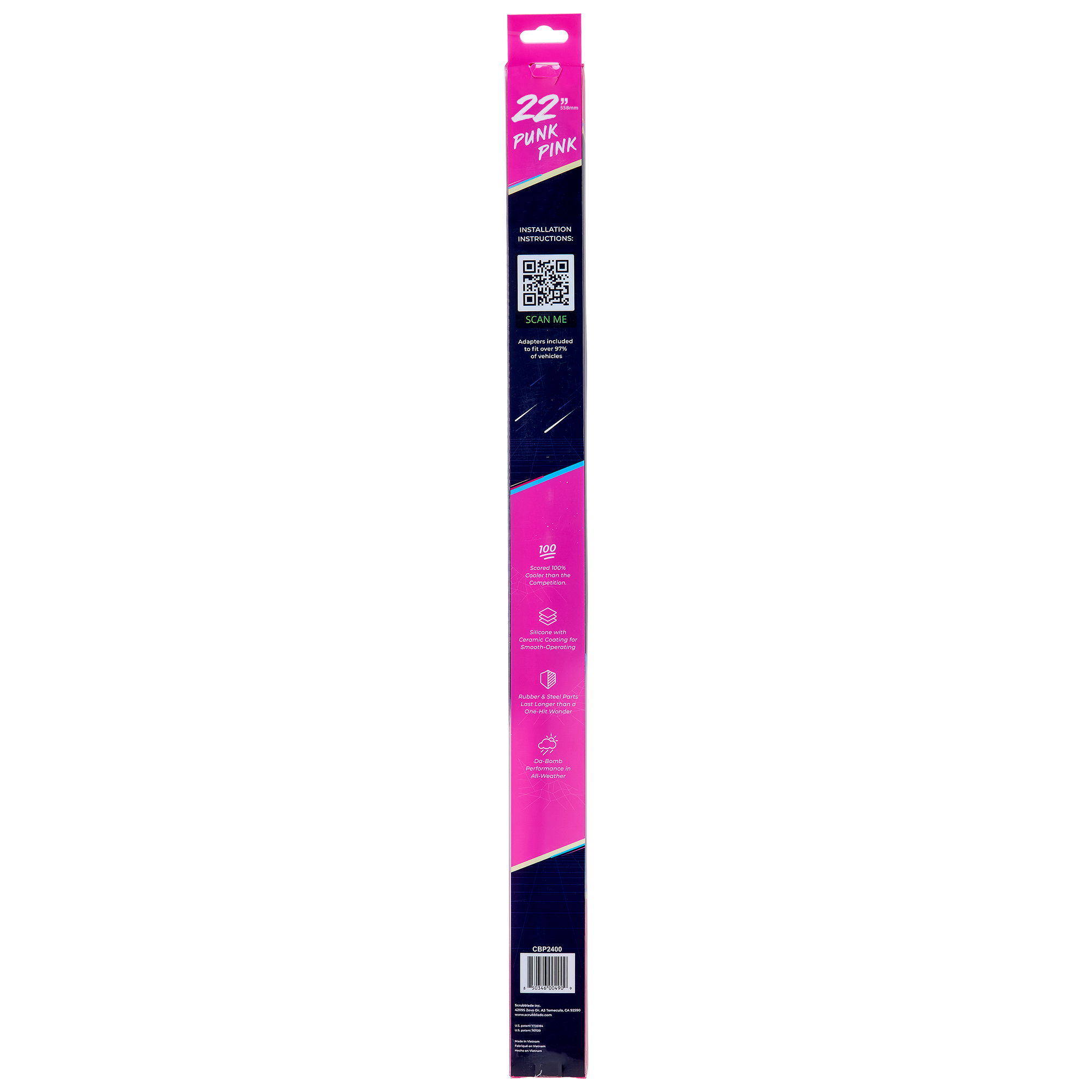 Scoring 100% cooler than the competition, Shadeblade is an ultra premium wiper blade, with a slick black rubber covered frame for Da-Bomb performance in all weather. A low profile to prevent wind lift and ceramic coated silicone blades in your choice of six colors for a quiet, smooth wipe. Innovative dual-action cleaning system to scrub + clear rain, bugs and road debris. Easy no tool installation with included adapters (4) to fit over 97% of all vehicles on and off the road. Shade Blade is the coolest patented wiper on the block! Made from a premium Ceramic coated Silicone, offered in multiple colors and branded with a Scrubblade logo for a true aftermarket vibe.