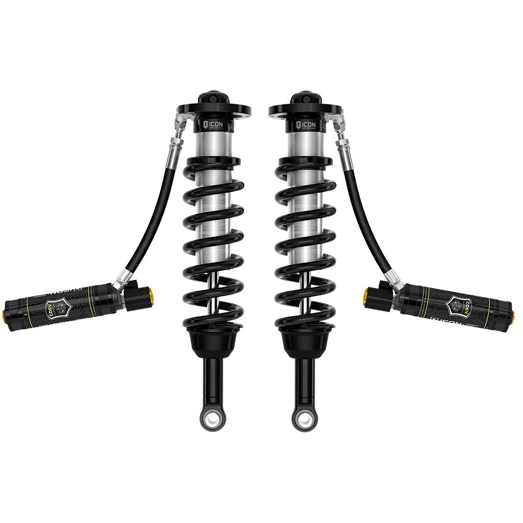 ICON Vehicle Dynamics V.S. 2.5 Series remote reservoir front coilover shocks are an incredible upgrade for the front end of the 2024-2025 Toyota Tacoma. These adjustable coilovers allow up 1.25-3” of lift height adjustability, allowing the use of larger, more aggressive wheel and tire combinations. ICON’s Vehicle-specific shock length and valving, their large 2.5” shock body with increased piston surface area over stock components, and their pairing with an ICON front differential drop (4WD only), yield the maximum travel possible along with superior ride quality and suspension performance both on- and off-road. Remote reservoirs greatly increase shock oil volume and heat dissipation surface area to resist overheating and cavitation under hard use, which can lead to damper fade. The ICON CDE Valve upgrade is included for those desiring an easy way to tune the ride electronically from inside the vehicle. Compression Damping Electronic Valve (CDEV) is an electronically controlled valve that meters the flow of oil to regulate the amount of damping force that is created by the shock when compressed. This infinitely variable valve can react in less than 40ms and has the ability to make extremely precise adjustments for varying terrain. CDEV’s hydraulic circuits are also custom tailored per application to create the highest resolution and dynamic range allowable for each specific vehicle. Powered by ICON Intelligent Control and proprietary ICON mobile app, the system uses information from the onboard G-force sensor and Gyroscope to perform calculations based on algorithms and user-defined settings to predict terrain and adjust shock settings via the CDEV accordingly. When paired with ICON 2.5 Aluminum Series CDEV rear shock absorbers, vehicle control will be balanced front to rear, resulting in the best overall driving experience for your Toyota Tacoma.