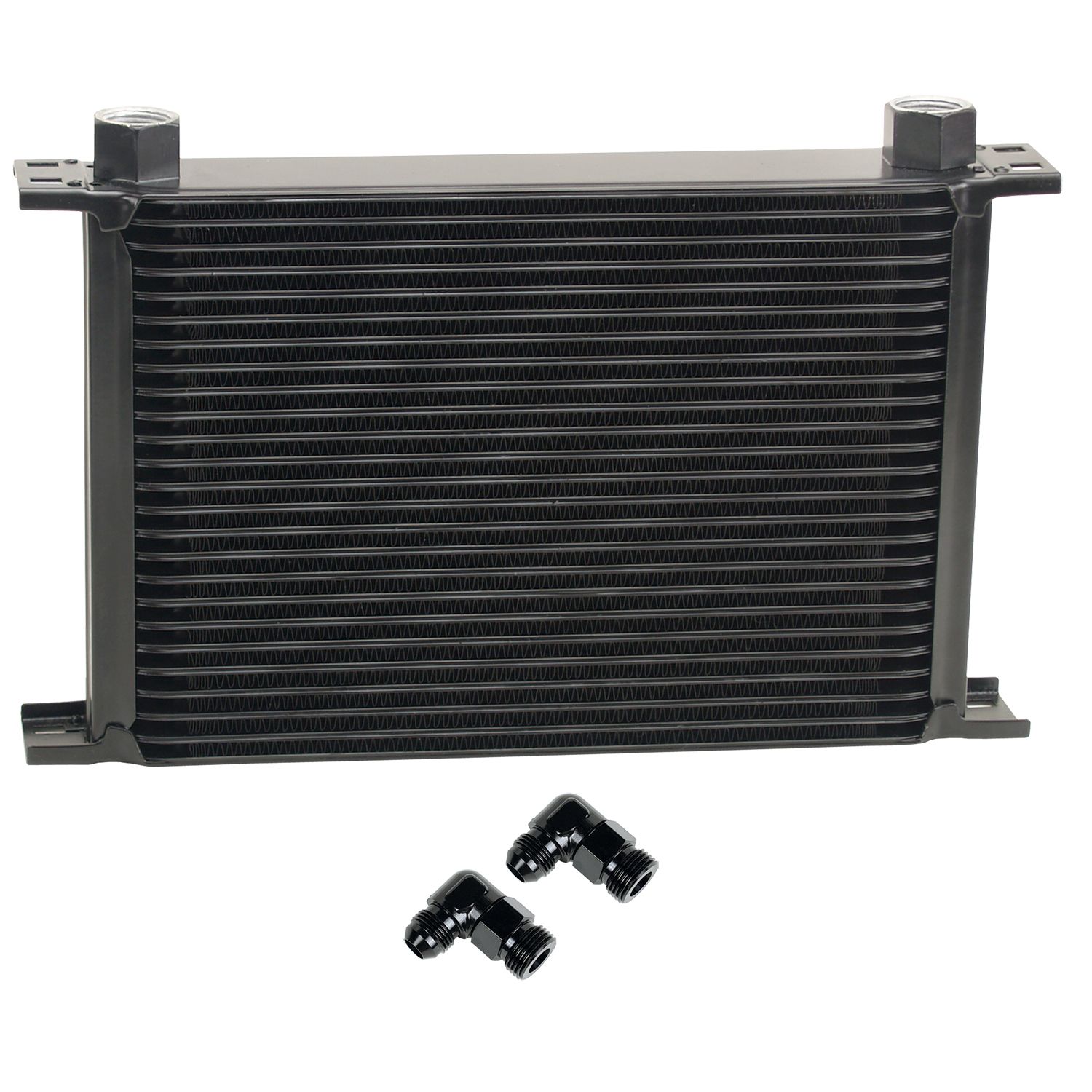 Our most efficient heat exchanger, the all aluminum 25 row Stacked Plate cooler features sturdy furnace brazed construction, full 2" deep turbulator-equipped plates and a black powder coat finish. With minimal pressure drop it can be used for engine, transmission or fuel cooling. Includes bright aluminum anodized finished 90 degree swivel -8AN male adapter fittings.