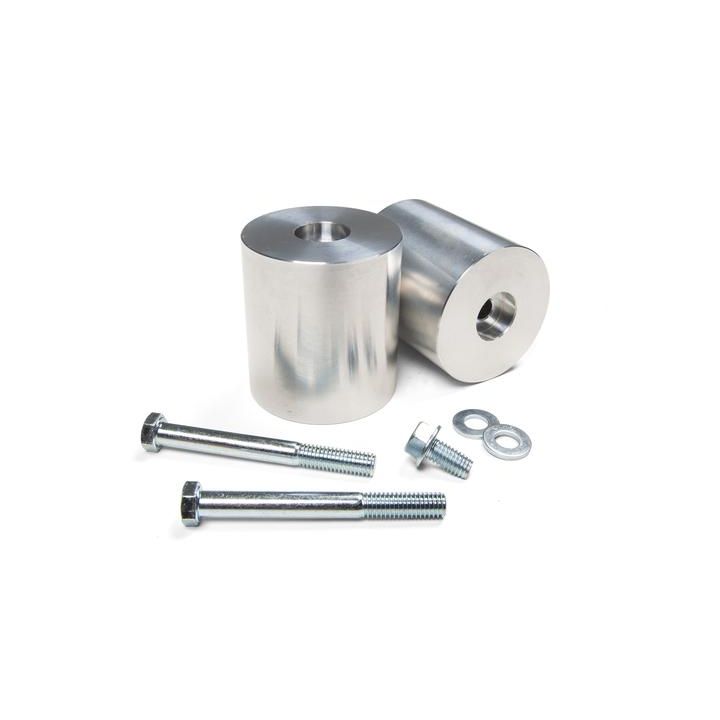 3" Jeep Bump Stop Extension Kit is comprised of a pair of 1 pc 3" billet aluminum bump stop spacers and mounting hardware. Another great solution from JKS Manufacturing. These extension spacers attach to the front coil spring axle mounts of Jeep JK, TJ, XJ, MJ and ZJ models. They will also work on the rear of a TJ. Large diameter design provides maximum surface area for the best bump stop contact possible.