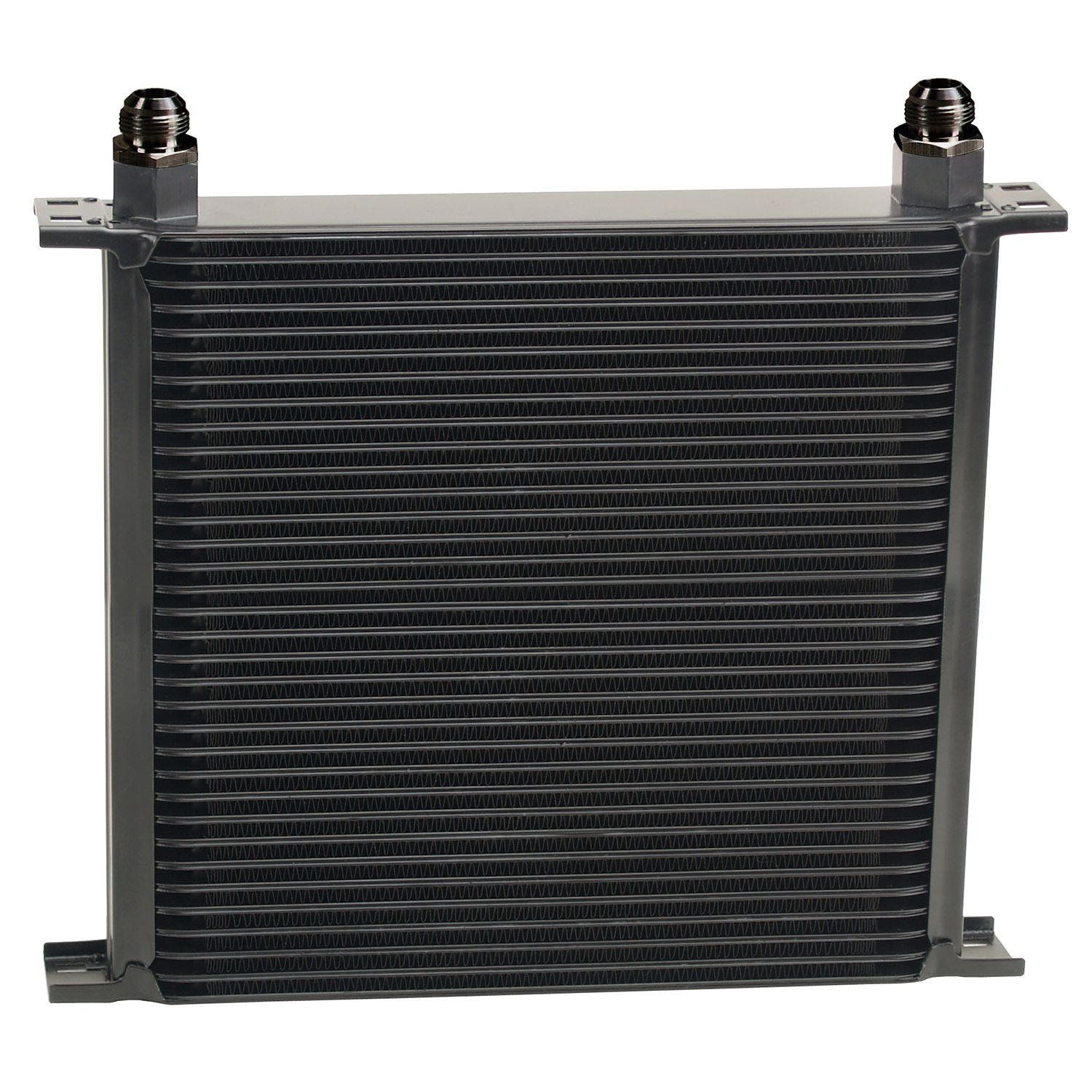 Our most efficient heat exchanger, the all aluminum 34 row Stacked Plate cooler features sturdy furnace brazed construction, full 2" deep turbulator-equipped plates and a black powder coat finish. With minimal pressure drop it can be used for engine, transmission or fuel cooling. Includes bright aluminum anodized finished -10AN male adapter fittings.