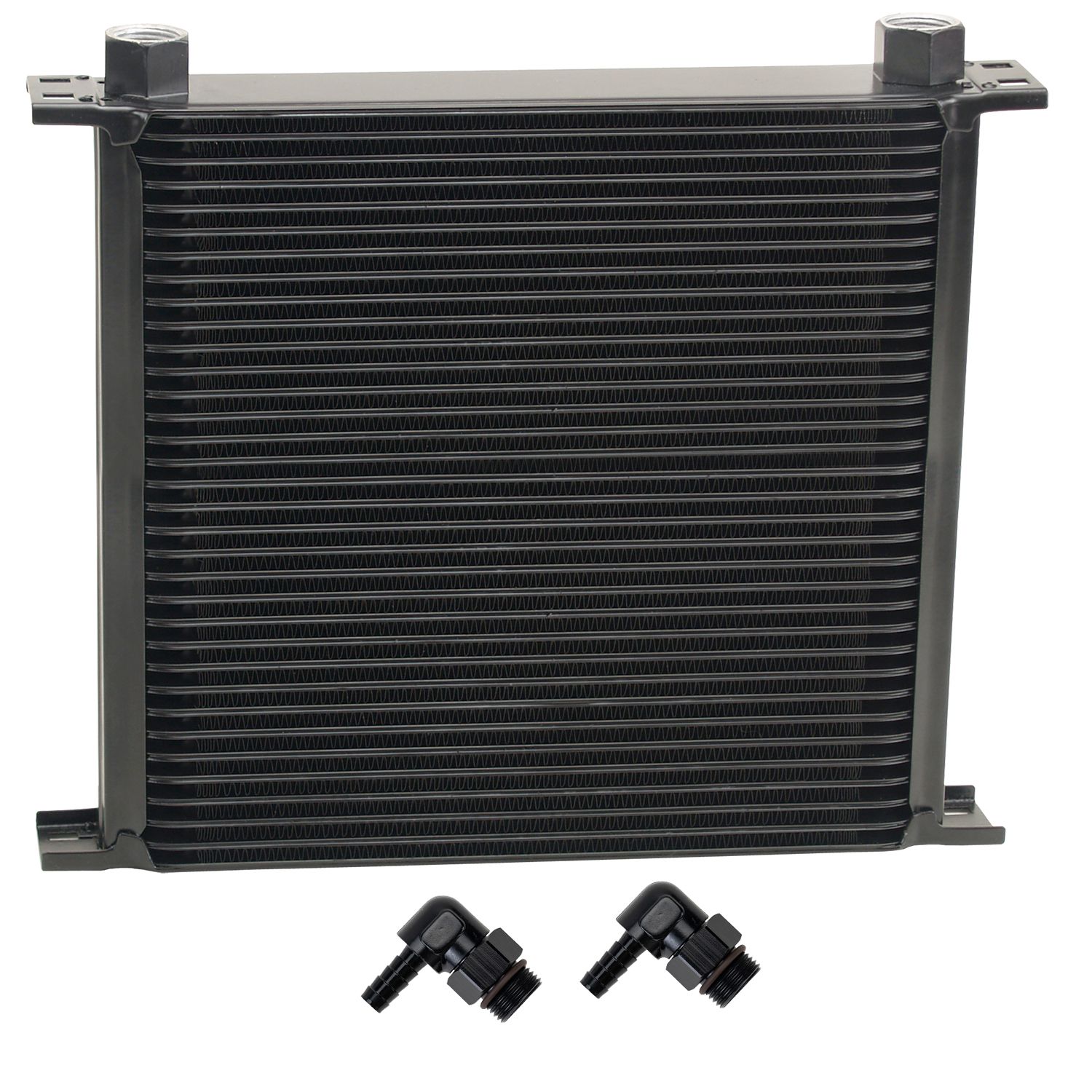 Our most efficient heat exchanger, the all aluminum 34 row Stacked Plate cooler features sturdy furnace brazed construction, full 2" deep turbulator-equipped plates and a black powder coat finish. With minimal pressure drop it can be used for engine, transmission or fuel cooling. Includes bright aluminum anodized finished 90 degree swivel -10AN male adapter fittings.