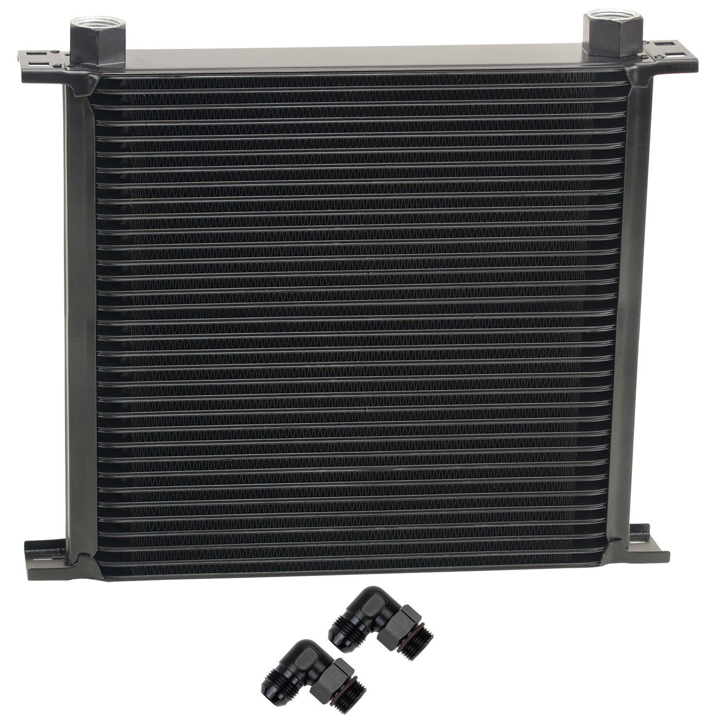Our most efficient heat exchanger, the all aluminum 34 row Stacked Plate cooler features sturdy furnace brazed construction, full 2" deep turbulator-equipped plates and a black powder coat finish. With minimal pressure drop it can be used for engine, transmission or fuel cooling. Includes bright aluminum anodized finished 90 degree swivel -10AN male adapter fittings.