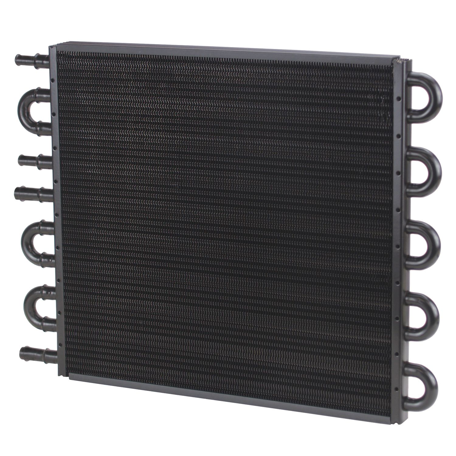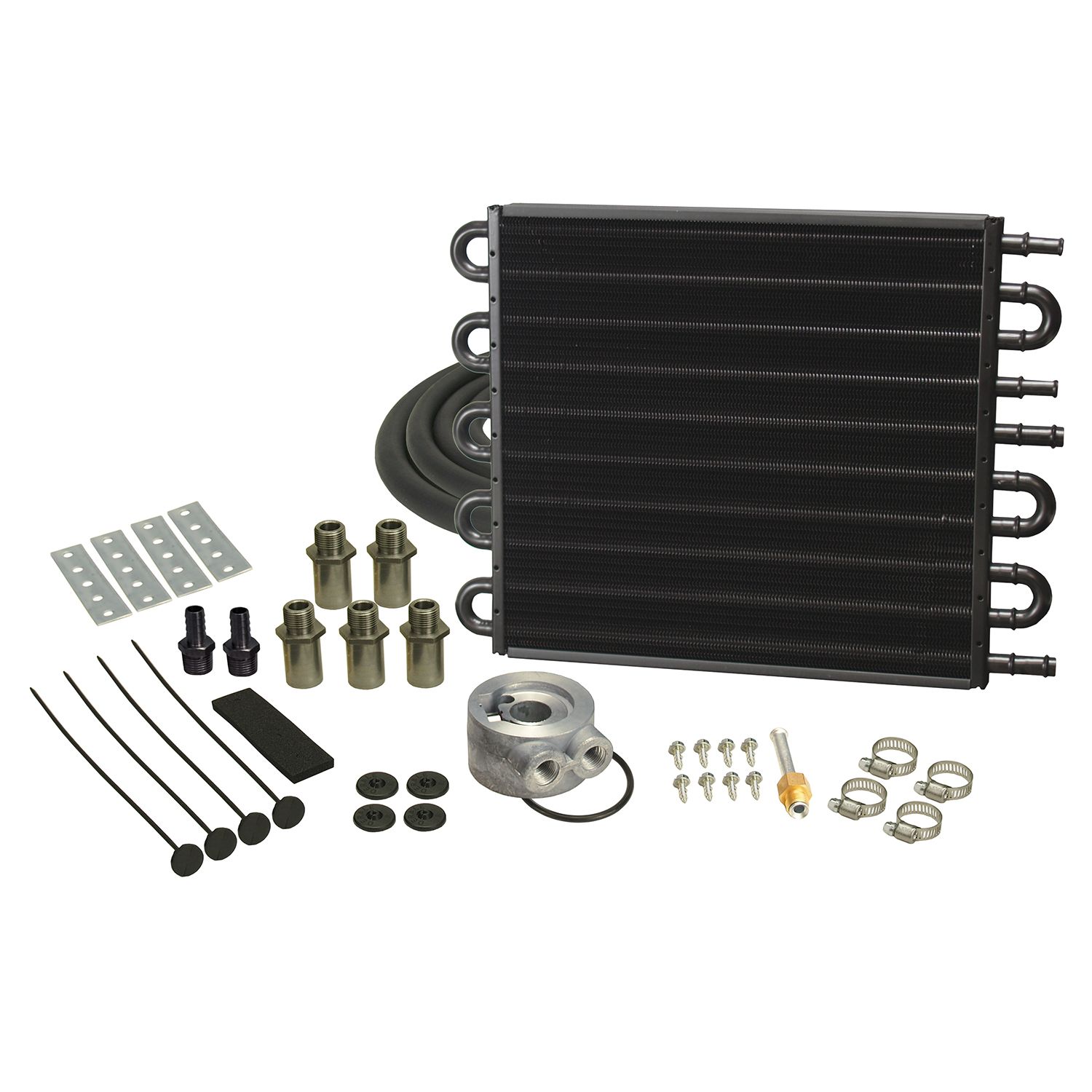 Featuring a free-flowing 4 & 6 pass cooler in one compact package and fabricated of 1/2" copper tubing and aluminum cooling fins, this Made-in-the-USA Dual-circuit cooler includes 2 each 11/32" and 2 each 1/2" barb inlets. It provides heat transfer capabilities for engine and transmission and kit also comes with a thermostatic sandwich adapter, cooler mounting rods, insta-dapt radiator adapter, hose clamps and 5 engine filter thread sizes to accommodate most vehicles. Made in the USA.