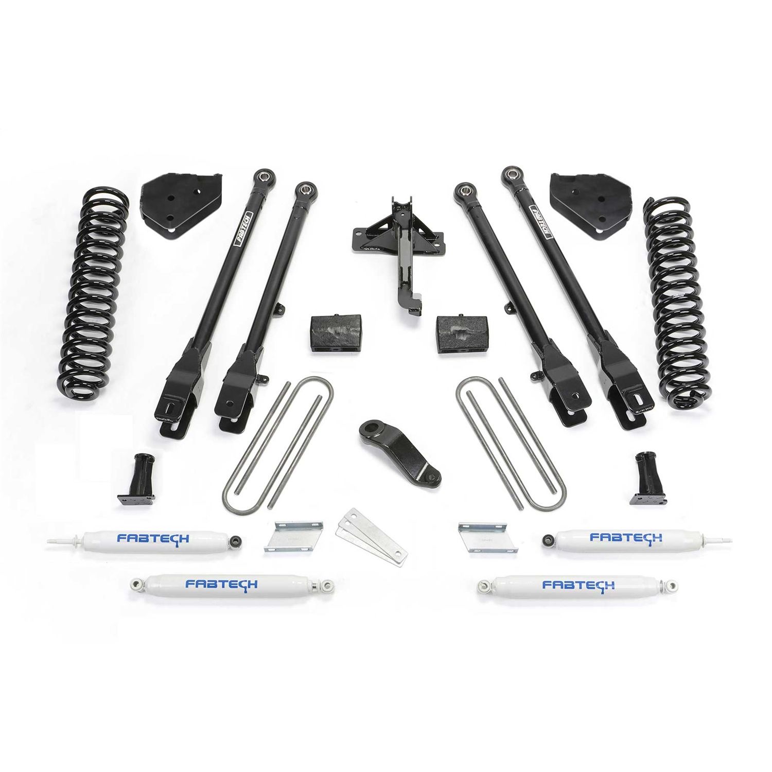 For the ultimate in suspension performance for the Super Duty we offer a bolt on 4 Link System that provides unsurpassed articulation and wheel travel. These 2 diameter heavy wall links feature race style 1 Uniballs for superior strength. Thick 1/4 steel brackets secure the 4 Links to the frame without cutting or welding. The system also includes Sway Bar Drops, Trac Bar relocation bracket, Pitman Arm, and U-Bolt kit.