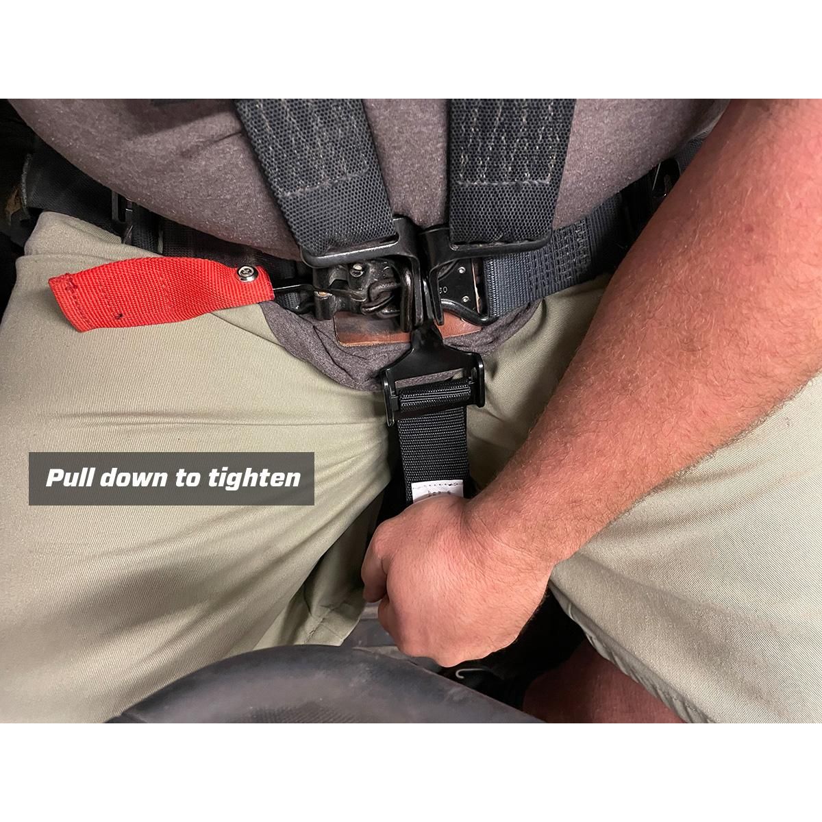 Add more comfort and safety to your ride! This 5 point harness with 2 inch belts provides great comfort and safety for off-road vehicles. The harness has sewn-in shoulder pads that stop chaffing on the neck and add extra comfort, especially on long rides. Includes all black hardware for cool styling, and EZ adjusters on the shoulders. The EZ adjusters allow you to adjust your shoulder straps quickly, even if they are dirty or muddy. Just use your finger and thumb to easily release the EZ Adjuster handle. This harness also features our redesigned SURELatch & link buckle to keep you secure and easily release at any angle (even upside down). The Bolt-In Tabs on the shoulders and lap can be bolted up to almost any vehicle, or wrapped around a harness bar. Includes adjustable sub strap, so you can easily adjust for different size riders. Why this harness? The 2" harnesses are great for smaller riders, because the belts fit better onto their shoulders. If you're worried about our most popular harness with the auto-buckle is going to get clogged with mud or dirt this belt will allow you to put those worries away! We bring back the classic latch and link buckle to the 4.2 belt! WARNING Proper installation and consistent use of the 5 point harness restraint system is critical to your safety in event of an accident.  To reduce the risk of serious injury or death: Follow vehicle manufacturers, and PRP Seats instructions and safety messages during installation and use of this product. Use all belts provided. Secure lap belt first; low and snug across hips. Sternum strap tight at chest line (min. 4” below the neck). Adjust remaining straps per instructions and confirm fitment restrains user & provides safe clearance from wheel, dash, roll cage, etc. Inspect all components of the 5 points harness restraint system regularly & replace as indicated by accident, wear, or abrasion. Ensure that the latch mechanism is properly latched and secure before each use.  This 5 point com