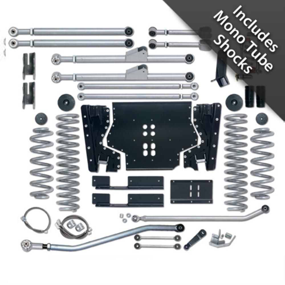 Rubicon Express Was The First To Comercially Offer A Long Arm Suspension System For The Jeep TJ. Our Extreme-Duty Long Arm System Set The Industry Standard By Which All Other Kits Have Been Measured. It Is Designed To Be A Complete Suspension Replacement, Which Utilizes Longer Control Arms To Improve Lifted Suspesnion Geometry. This System Will Offer You Superior Stability On And Off Road, Reduced Torque Roll, And Enhanced Trail Traction Over Standard Short Arm Lift Systems. The Rubicon Extreme-Duty Long Arm Suspension System Includes A Three-Piece Belly Pan For Easy Transfer Case And Transmission Access. Our TJ Extreme-Duty Long Arm Suspension System Is The Best Performing And Most Technologically Advanced System Of Its Kind; There Is No Better Long Arm Suspension System Available For Your TJ. The First And Still The Best.