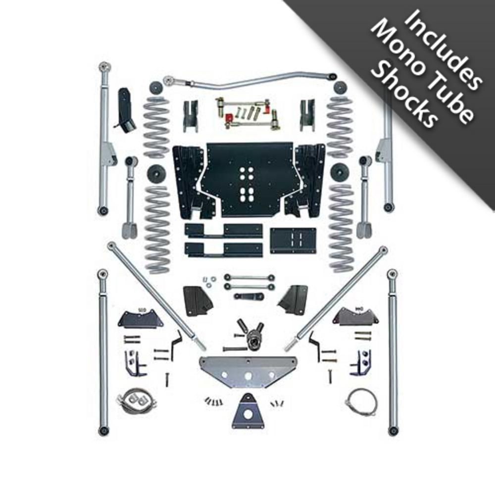 Rubicon Express Was The First To Comercially Offer A Long Arm Suspension System For The Jeep TJ; This Same Industry Leading Design Is Available For The Wrangler Unlimited LJ.Our LJ Extreme-Duty Long Arm System Is Designed To Be A Complete Suspension Replacement, Which Utilizes Longer Control Arms To Improve Lifted Suspension Geometry. This System Will Offer You Superior Stability On And Off Road, Reduced Torque Roll, And Enhanced Trail Traction Over Standard Short Arm Lift Systems. The Rubicon Extreme-Duty Long Arm Suspension System Includes A Three-Piece Belly Pan For Easy Transfer Case And Transmission Access. Our LJ Extreme-Duty Long Arm Suspension System Is The Best Performing And Most Technologically Advanced System Of Its Kind; There Is No Better Long Arm Suspension System Available For Your LJ. The First And Still The Best. Rubicon'S Long Arm Tri-Link System Eliminates The Rear Track Bar, Allowing For True Up/Down Wheel Travel, While Enhancing Anti-Squat For Those Steep ClimBS. On-Road Tracking Is Improved, And The Kit Is Bolt-On For Factory Dana 35 And Dana 44 Rear Ends. Kit Includes Front And Rear Control Arms Using 2 .250 Wall, 4130 Chromoly Material. Also Included With The Kit Is Rubicon'S Newest Misalignment Joint Design, The Builder Ball. This Setup Eliminates The Rear Track Bar And Has Up To 32 Degrees Of Misalignment In A Giant-Sized 3" Od Housing.