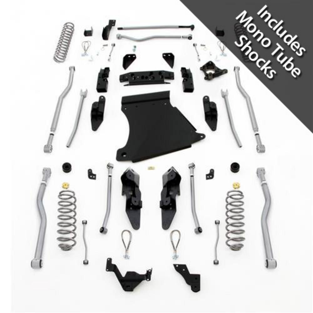 The Latest Addition To The Rubicon Express JK Suspension Offering Is Our Complete 4-Link Extreme-Duty Long Arm System. These High Performance Suspension Systems Deliver Both Performance And Control That Are Unmatched By Any Other Long Arm Kit On The Market. They Feature Adjustable Chromoly Upper And Lower Control Arms That Will Stand Up To Anything You Can Drive Over. With Pt-Meg Super-Ride Bushings And Super-Flex Joints They Are Sure To Provide Superior Handing While Not Limiting Articulation. The Kits Full Width Heavy-Duty Transmission Crossmember Allows For More Durability And Frame Rigidity Then The Competition. This Also Allows For Installation That Is Much Easier That Competitors Kits Eliminating The Need For Welding. An Optional Robust Belly Pan, And CNC Machine Steering Knuckle Provide Outstanding Upgrades. Systems Can Be Ordered In 3.5", 4.5" And 5.5" Lift Heights With Optional High Performance Monotube Shocks. Like All Rubicon Express Systems, They Are Made In The Usa And Backed By The Rubicon Express Advantage Lifetime Warranty.