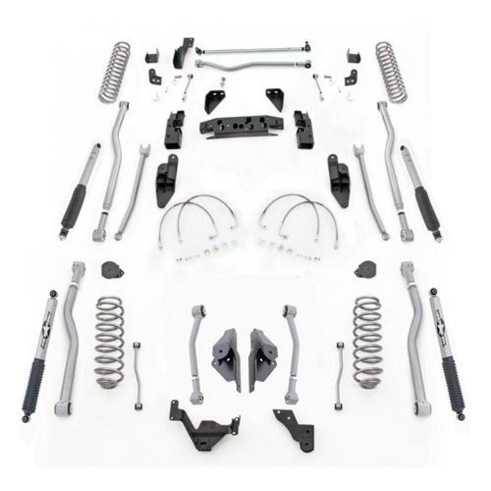 The Latest Addition To The Rubicon Express JK Suspension Offering Is Our Complete 4-Link Extreme-Duty Long Arm System. These High Performance Suspension Systems Deliver Both Performance And Control That Are Unmatched By Any Other Long Arm Kit On The Market. They Feature Adjustable Chromoly Upper And Lower Control Arms That Will Stand Up To Anything You Can Drive Over. With Pt-Meg Super-Ride Bushings And Super-Flex Joints They Are Sure To Provide Superior Handing While Not Limiting Articulation. The Kits Full Width Heavy-Duty Transmission Crossmember Allows For More Durability And Frame Rigidity Then The Competition. This Also Allows For Installation That Is Much Easier That Competitors Kits Eliminating The Need For Welding. An Optional Robust Belly Pan, And CNC Machine Steering Knuckle Provide Outstanding Upgrades. Systems Can Be Ordered In 3.5", 4.5" And 5.5" Lift Heights With Optional High Performance Monotube Shocks. Like All Rubicon Express Systems, They Are Made In The Usa And Backed By The Rubicon Express Advantage Lifetime Warranty.
