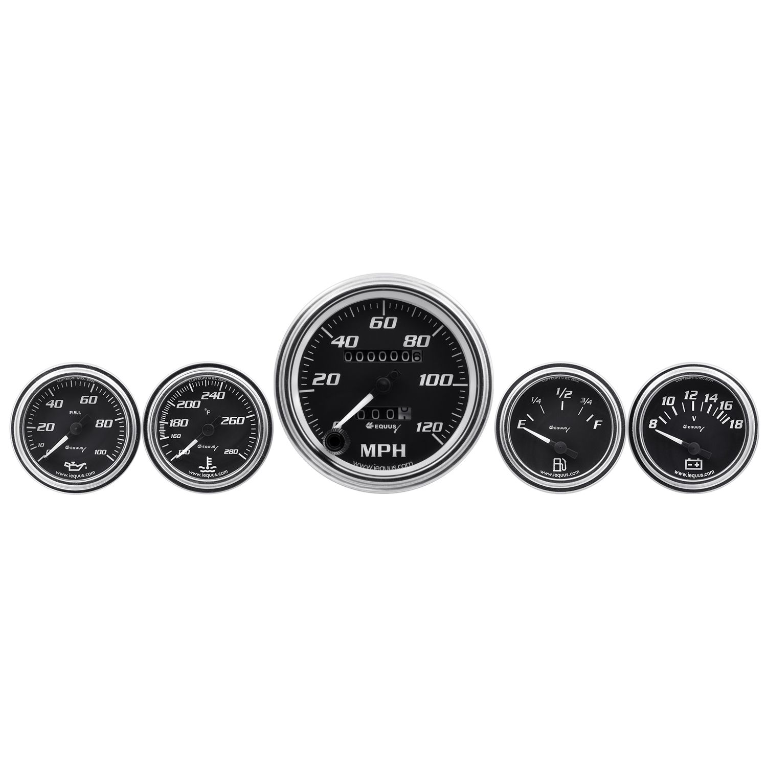 This attractive, durable, and affordable Equus 7000 Classic series five piece mechanical gauge set features elegantly styled black dial, chrome bezel, backlit instruments for monitoring speed, oil pressure, water temperature, voltage and fuel level. Installation hardware included. Additional adapters sold separately.