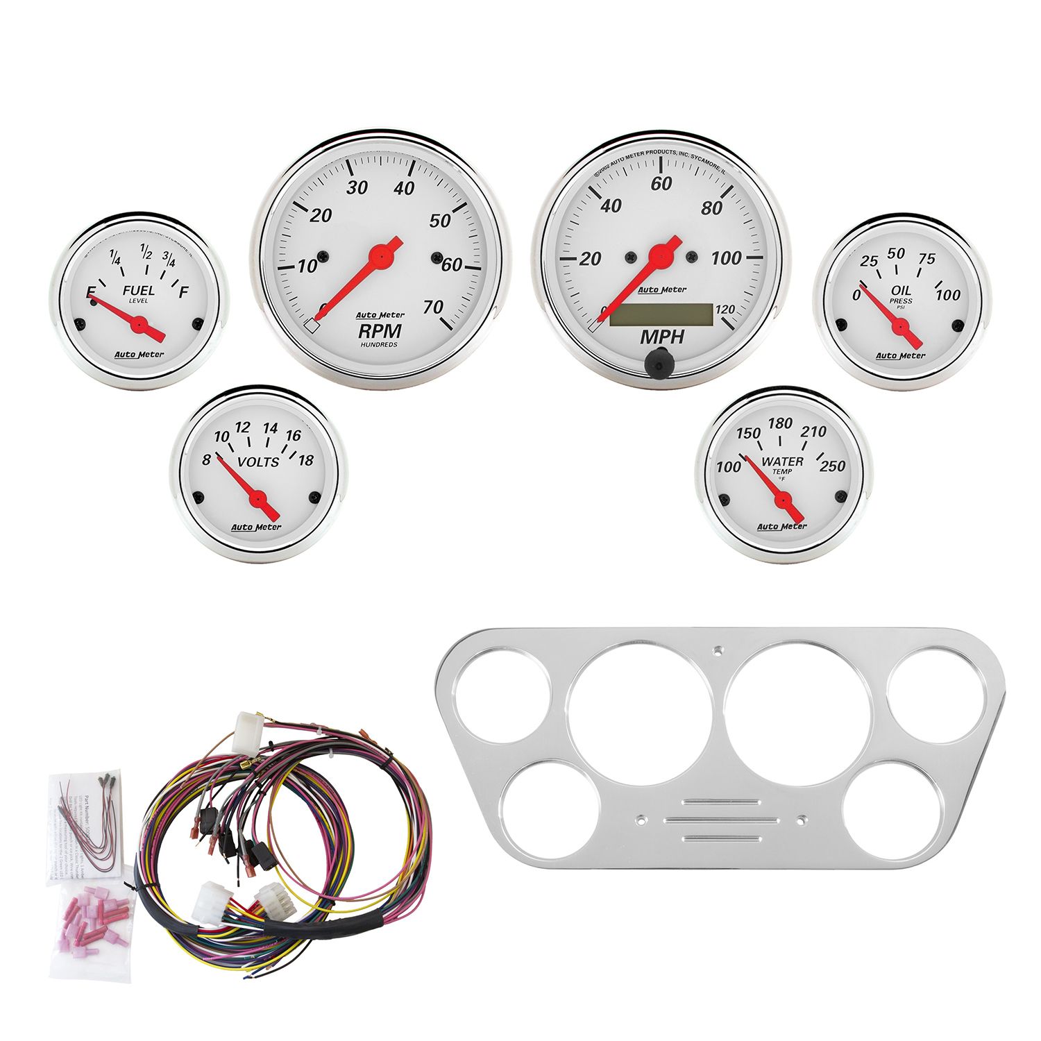 Upgrade your classic 53-55 Ford Pickup Truck with an AutoMeter direct-fit dash kit. This easy-to-install package includes a polished,CNC machined billet aluminum replacement dash panel and five iconic Arctic White series gauges featuring polar white dials,retro artwork,high contrast fluorescent red pointers,domed lenses and bright chrome bezels. Warm white perimeter dial lighting ensures a traditional appearance while our easy,no fab installation allows you to preserve the original interior of your classic ride.