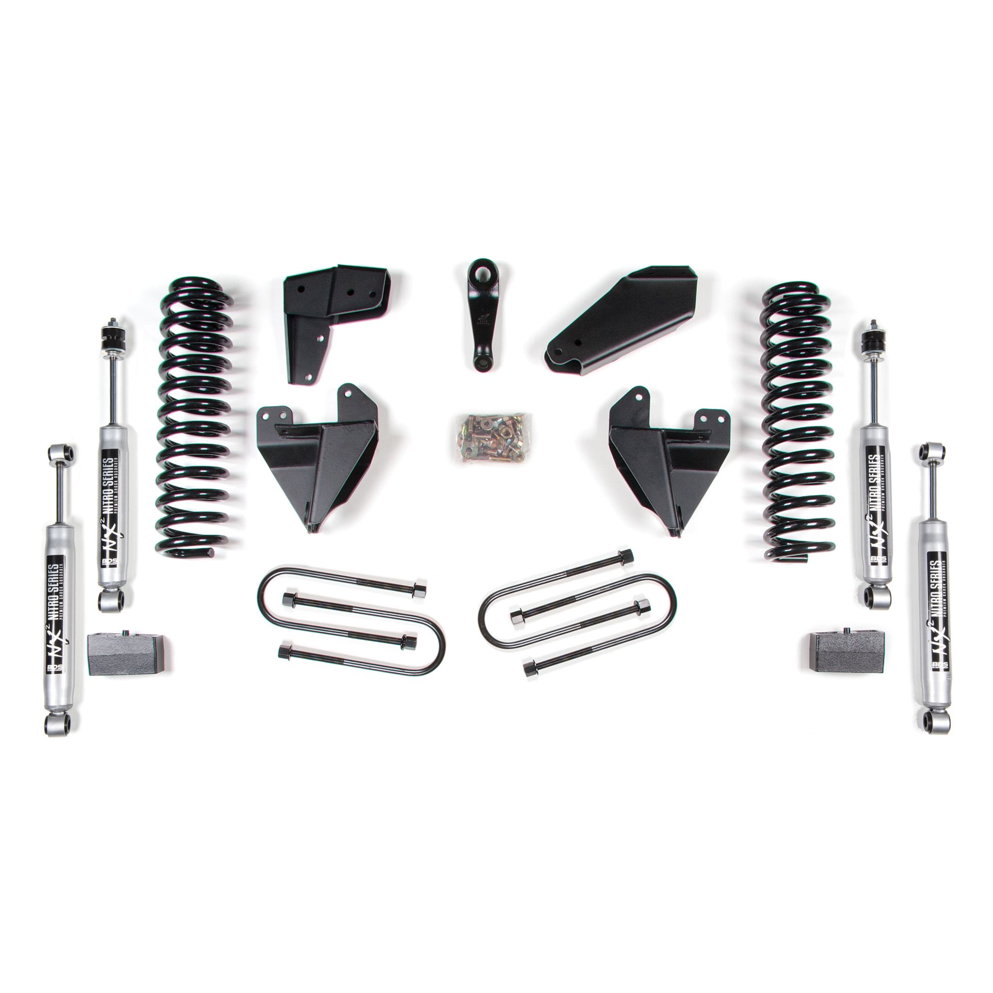 <p>In the rear the base kit utilizes a high-strength lift block, longer u-bolts and a matching set of NX2 Nitro shocks.</p>
