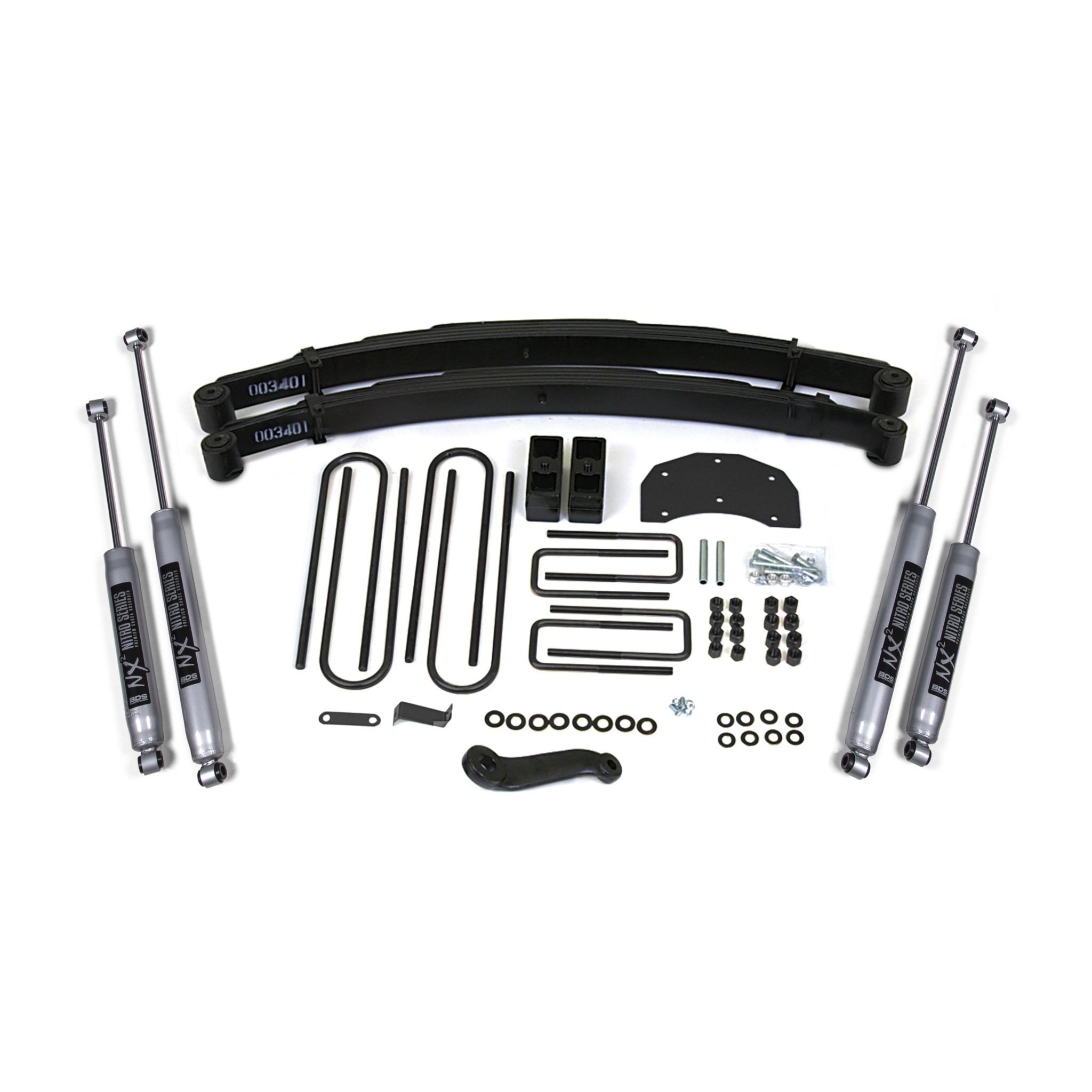 <p>Up front the lift kit includes Glide-Ride leaf springs, forged drop pitman arm and track bar bracket for steering correction, and precision tuned NX2 or FOX nitrogen charged shocks.</p>