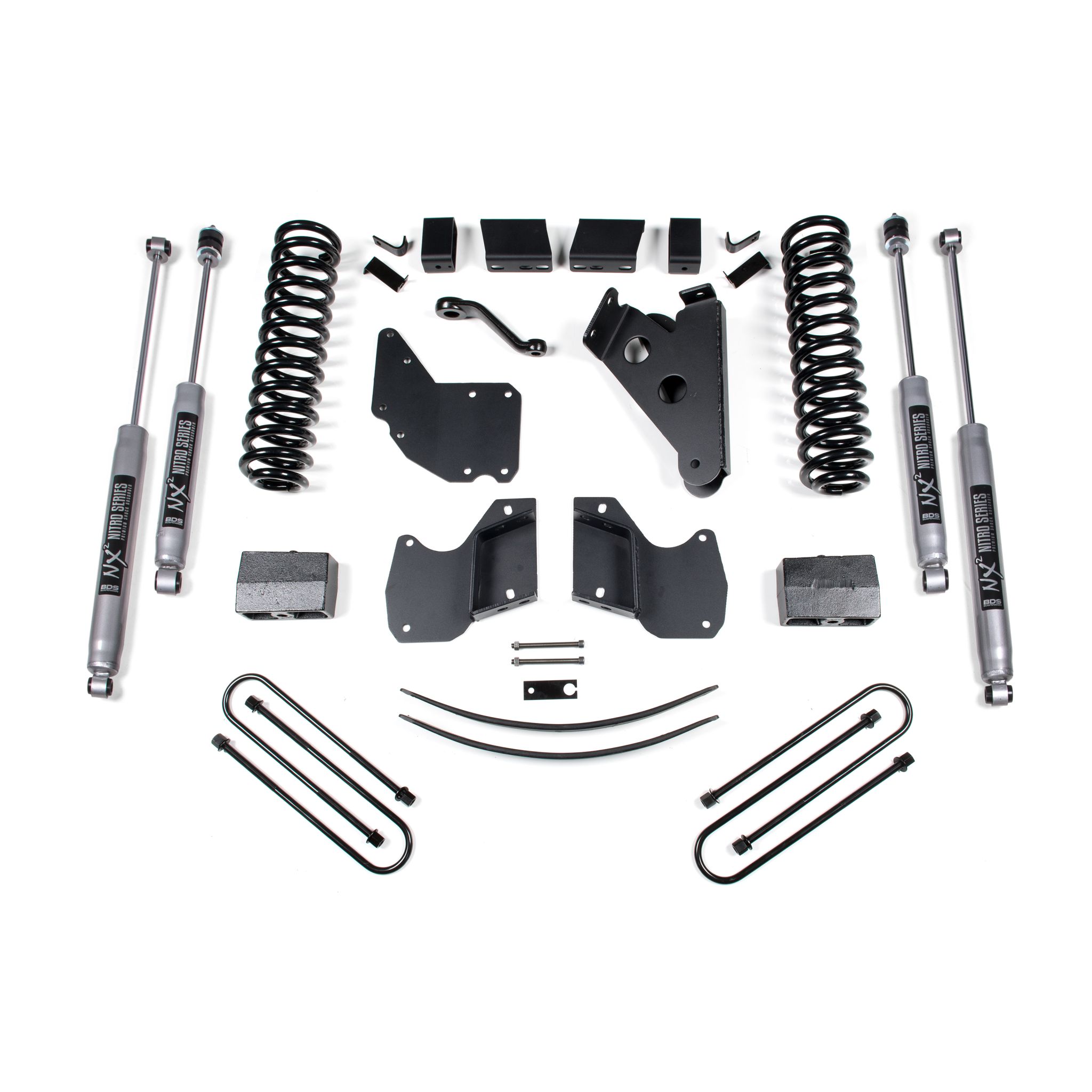 <p>Up front the lift kit includes Pro-Ride coil springs, heavy duty axle pivot brackets, radius arm drop brackets, forged pitman arm for steering correction, bump stop extensions and precision tuned NX2 nitrogen charged shocks.</p>