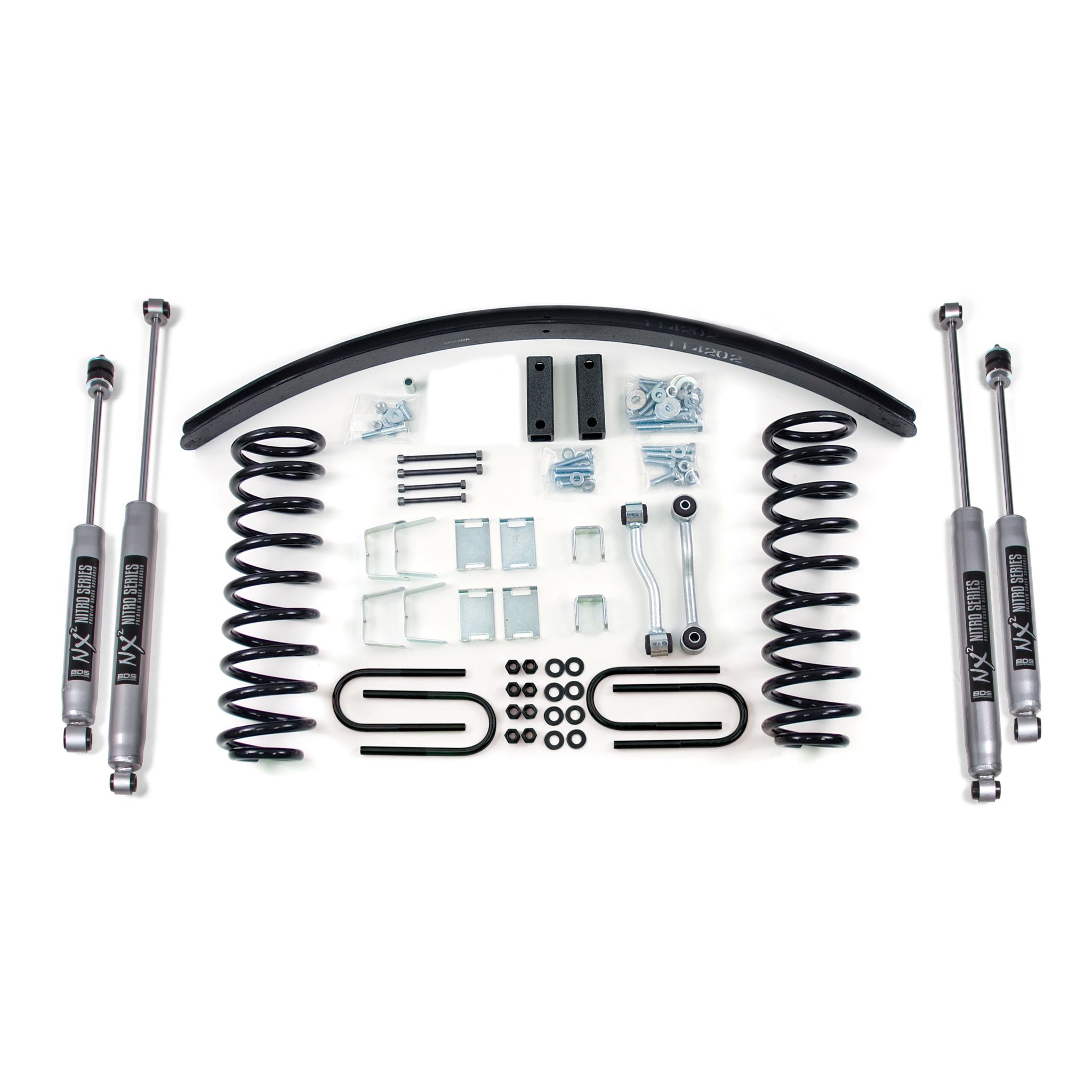 <p>Up front the lift kit includes Glide-Ride coil springs, extended sway bar links, and a transfer case drop to maintain proper driveline angles. In the rear the kit utilizes a long thin add-a-leaf to add height without creating a harsh ride and a 5/8" lift block to level out the Jeep. These kits are rounded out with your choice of specially tuned NX2 nitro series gas shocks or FOX 2.0 IFP performance series gas shocks to offer improved damper performance.</p>