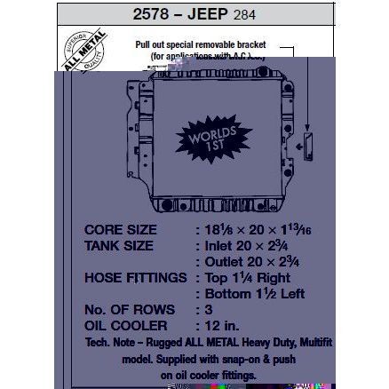 World exclusive multi-fit model, only from CSF – fits all automatic and manual Wrangler YJ and TJ models. CSF's #1 selling copper/brass Jeep model with over 20,000 sold – a cult favorite among Jeep enthusiasts who wish to keep their original style copper/brass radiator, but desire higher performance and more durability. CSF has over 5 decades of experience manufacturing radiators. So when it comes to keeping your engine cool and your Wrangler running at its finest, a CSF Heavy-Duty Radiator is the obvious choice. CSF has spent years refining and improving their radiator designs. The original style copper/brass construction features ribbed brass end tanks for additional strength and reinforced side end plates and integrated metal core straps to withstand heavy vibration and chassis flex while off-roading. The 3-Row 46mm Heavy-Duty and High-Performance Copper Core offers the best cooling available in a design that is a true "drop-in" fit with no modifications necessary for installation. Whether you are off-roading, towing, or just casually driving your Wrangler, trust the cooling experts at CSF for the best performing, high-quality, and reliable radiators.