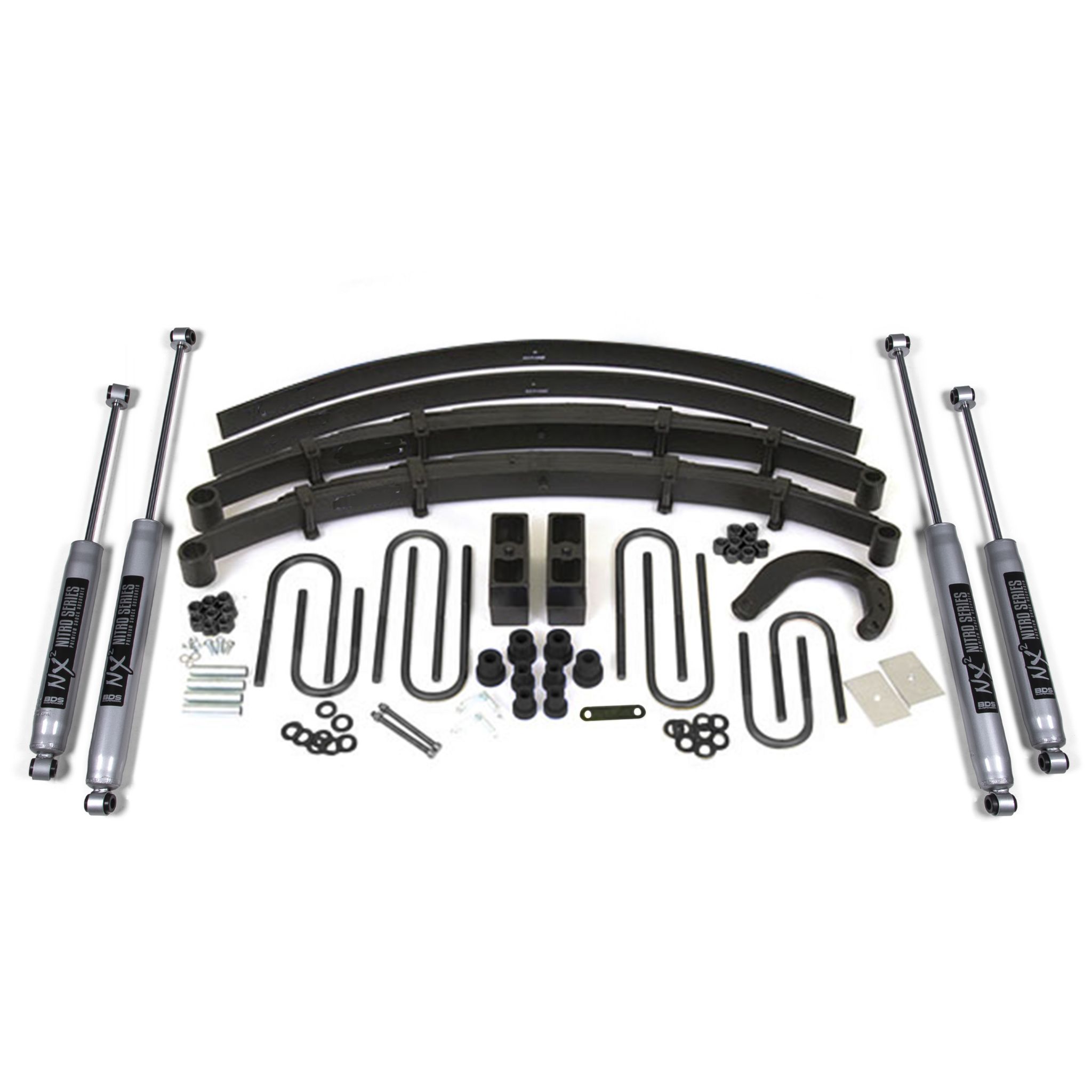 <p>Up front, the lift kit includes Glide-Ride leaf springs, 4" steering arm for steering correction, brake line brackets, and precision-tuned NX2 nitrogen-charged shocks. In the rear, this kit utilizes a high-strength lift block, longer u-bolts, and a matching set of NX2 Nitro shocks.</p>