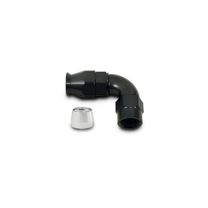 Vibrants offering of non-swivel High Flow Hose End Fittings, designed exclusively for use with our offering of PTFE lined flex hose, deliver the type of quality, leak-free reliability and incredible ease of assembly that industry professionals will appreciate. Now also available in -12 AN. These CNC Machined 6061 Aluminum Alloy Hose Ends feature a full flow design and are optimal for use in race fuel systems as well as Nitrous, Cooling, Oil, Power Steering and Coolant (not suited for brake and hydraulic line applications). Each of these Hose Ends include an Aluminum olive that compresses to the PTFE liner for simple, leak free assembly. Available in Black Hard Anodized finish only.