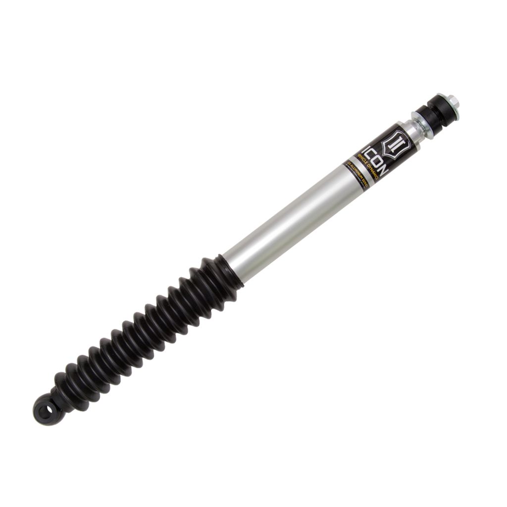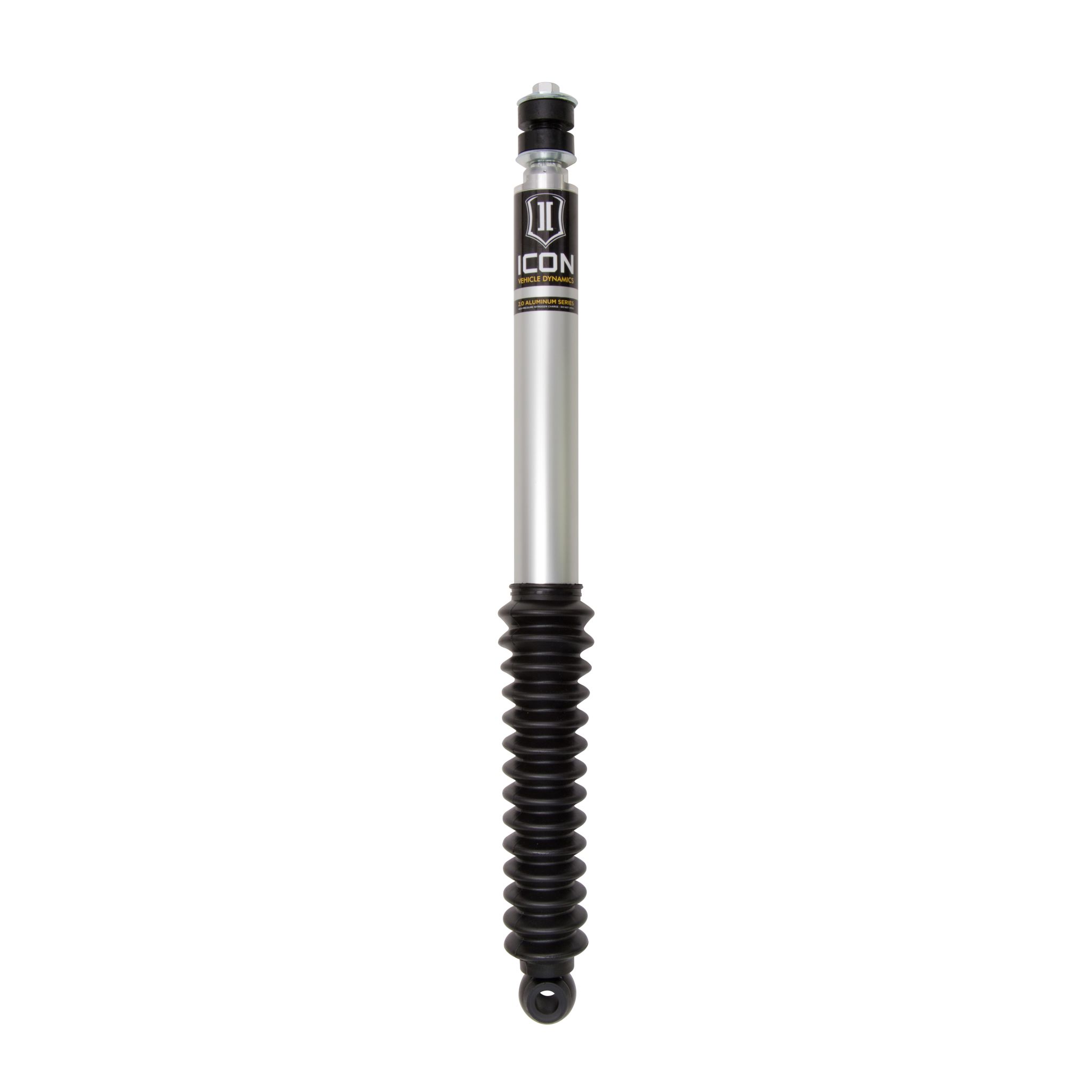 Attributed Description: ICON Vehicle Dynamics; Shock Absorber; Adjustable: No; Boot Included: Yes; Coil Over Springs Included: No; Dust Shield: No; Gas Charged: Yes; Lower Mount Type: Eyelet; Shock Absorber Body End Measuring Point: Shoulder of Stem; Shock Absorber Rod End Measuring Point: Center of Eyelet; Upper Mount Type: Stem; Remote Reservoir: No; Body Diameter: 2 IN; Compressed Length: 15.850 IN; Fully Open Length: 25.67 IN; Shock Stroke: 9.82 IN; Travel Length: 9.82 IN