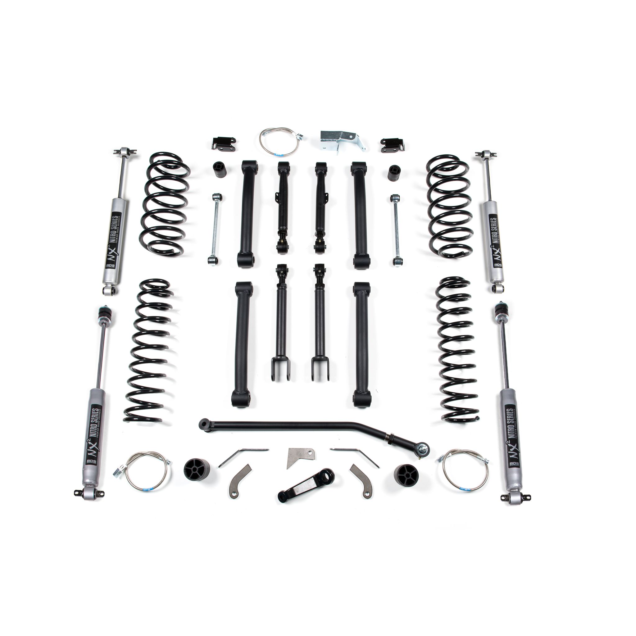 <p>The rear kit utilizes Glide-Ride coil springs for maximum travel, stainless braided brake line, rear track bar relocation bracket, BDS ultimate sway bar disconnects for the most possible articulation, and heavy duty front upper adjustable and fixed length lower control arms. Finish of the kit with your choice of specially tuned NX2 nitro series gas shocks or FOX 2.0 IFP performance series gas shocks to offer improved damper performance.</p>