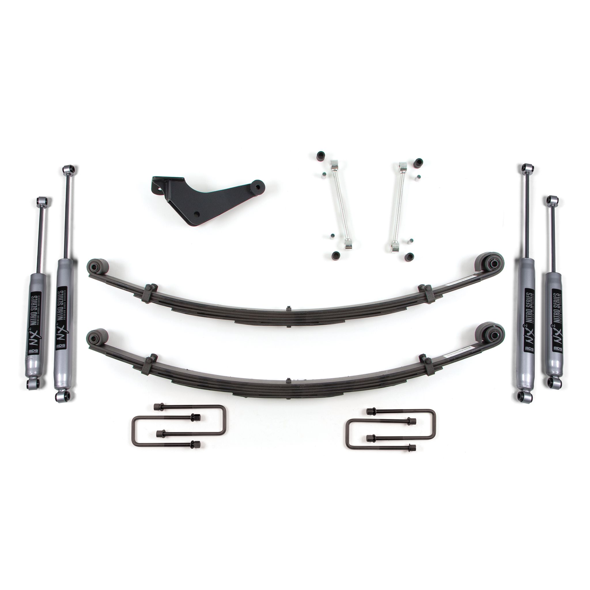 <p>Up front, the lift kit includes Glide-Ride leaf springs, a track bar bracket for steering correction, extended sway bar links, and custom-tuned nitrogen-charged shocks. In the rear, this kit utilizes a matching set of NX2 Nitro or FOX Performance shocks.</p>
