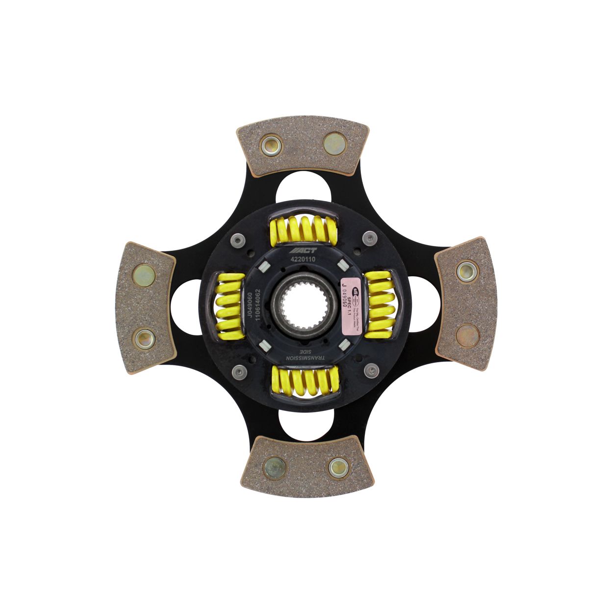 4220110 is a 4-pad spring-centered race disc made with high quality, ceramic friction materials. The engagement is harsher, but shifting is faster. The heavy duty torsional dampening springs are stronger, in most cases, than standard springs and are provided in the best sizes and spring rates to suit the application. The race disc features a heat-treated spring steel drive plate and is well-suited for the smaller disc sizes in smaller engines.