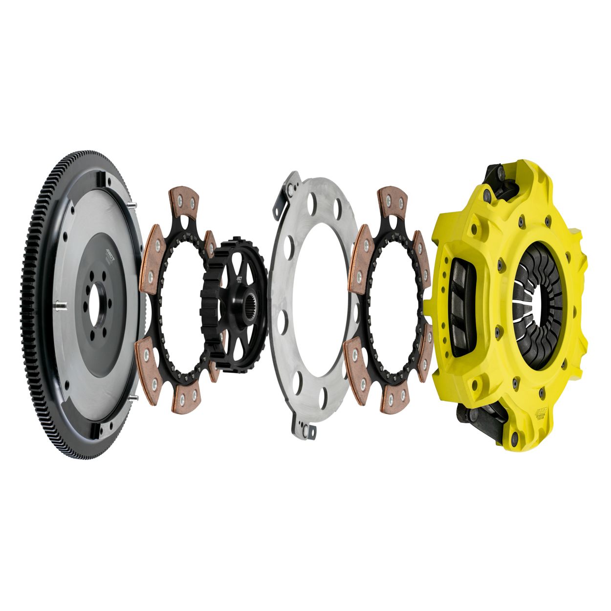 T1R-G14 Mod-Twin 10.5 HD Rigid Race Kit tackles aggressive launches and rapid shifting of high-powered machines by combining twice the ceramic friction surfaces with a no-nonsense solid Mono-Drive hub in a completely modular design. Each diaphragm spring endures an exclusive four-stage heat treating process to provide a light and consistent pedal feel. Puck-style Friction Plates with high quality ceramic friction materials deliver high friction coefficient, superior heat capacity, and long clutch life. These Friction Plates uniformly transfer torque to a Mono-Drive Chromoly hub, which is heat treated for strength and durability, extending input shaft life with one continuous spline. The lightweight, rigid design allows for quicker shifts and trouble-free service. This kit includes a CNC-machined and dynamically balanced flywheel, pressure plate cover, diaphragm spring, face, puck-style ceramic friction plates, rigid Mono-Drive hub, floater, alignment tool and pilot bearing (where applicable). Mod-Twin clutches are fully rebuildable, and replacement discs may be ordered separately.
