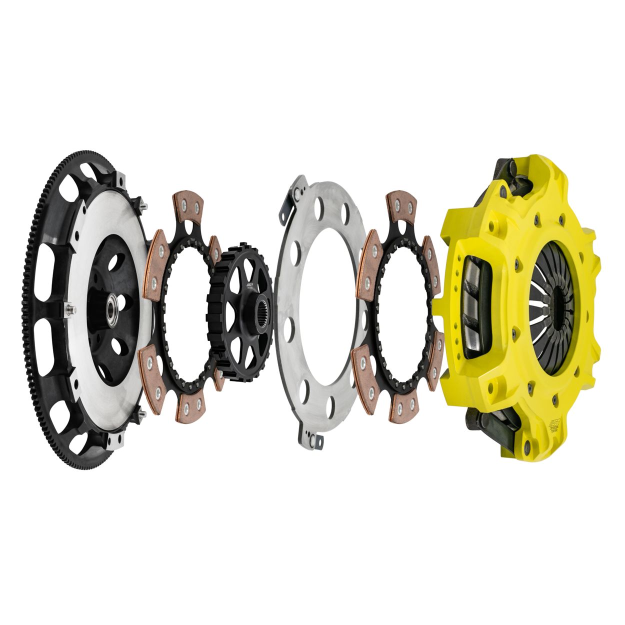T1R-F12 Mod-Twin 10.5 HD Rigid Race Kit tackles aggressive launches and rapid shifting of high-powered machines by combining twice the ceramic friction surfaces with a no-nonsense solid Mono-Drive hub in a completely modular design. Each diaphragm spring endures an exclusive four-stage heat treating process to provide a light and consistent pedal feel. Puck-style Friction Plates with high quality ceramic friction materials deliver high friction coefficient, superior heat capacity, and long clutch life. These Friction Plates uniformly transfer torque to a Mono-Drive Chromoly hub, which is heat treated for strength and durability, extending input shaft life with one continuous spline. The lightweight, rigid design allows for quicker shifts and trouble-free service. This kit includes a CNC-machined and dynamically balanced flywheel, pressure plate cover, diaphragm spring, face, puck-style ceramic friction plates, rigid Mono-Drive hub, floater, alignment tool and pilot bearing (where applicable). Mod-Twin clutches are fully rebuildable, and replacement discs may be ordered separately.