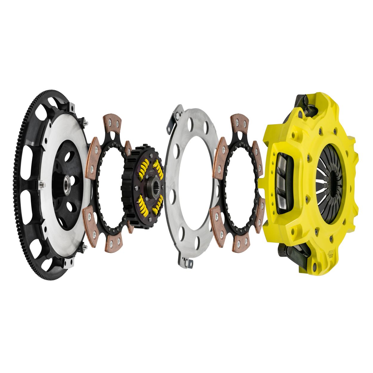T1RS-F12 Mod-Twin 10.5 HD Sprung Race Kit performs aggressive launches and smoother shifting in high-powered machines by combining twice the ceramic friction surfaces with an ultra-durable sprung Mono-Drive hub assembly in a completely modular design. Each diaphragm spring endures an exclusive four-stage heat treating process providing a consistent light pedal feel. Puck-style Friction Plates with high quality ceramic friction materials deliver high friction coefficient, superior heat capacity, and long clutch life. These Friction Plates uniformly transfer torque to a Mono-Drive sprung hub assembly, which extends input shaft life and reduces driveline shock from torsional vibration. This kit includes a CNC-machined and dynamically balanced flywheel, pressure plate cover, diaphragm spring, face, puck-style ceramic friction plates, sprung Mono-Drive hub assembly, floater, patented Monoloc Collar, release bearing, alignment tool and pilot bearing (where applicable). Mod-Twin clutches are fully rebuildable, and replacement discs may be ordered separately.