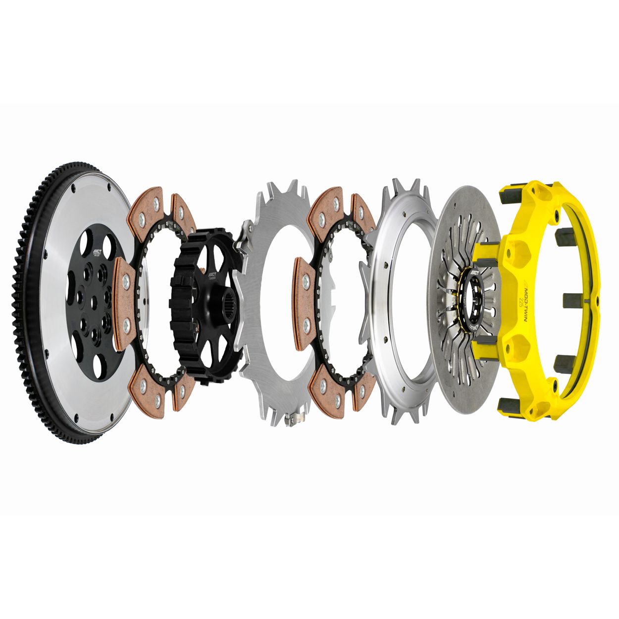 T1R-M03 Mod-Twin 225 HD Rigid Race Kit tackles aggressive launches and rapid shifting of high powered AWD’s by combining twice the ceramic friction surfaces with a no-nonsense solid Mono-Drive hub in a completely modular design. Each diaphragm spring endures an exclusive four-stage heat treating process providing a consistent light pedal feel. Puck-style Friction Plates with high quality ceramic friction materials deliver high friction coefficient, superior heat capacity, and long clutch life. These Friction Plates uniformly transfer torque to a Mono-Drive chrome-moly hub which is heat treated for strength and durability extending input shaft life with one continuous spline. The lightweight, rigid design allows for quicker shifts and trouble-free service. This kit includes a CNC-machined and dynamically balanced flywheel, pressure plate cover, diaphragm spring, face, puck-style ceramic friction plates, rigid Mono-Drive hub, floater, patented Monoloc Collar, release bearing, alignment tool and pilot bearing (if needed). Mod-Twin clutches are fully rebuildable and most components can be ordered separately.
