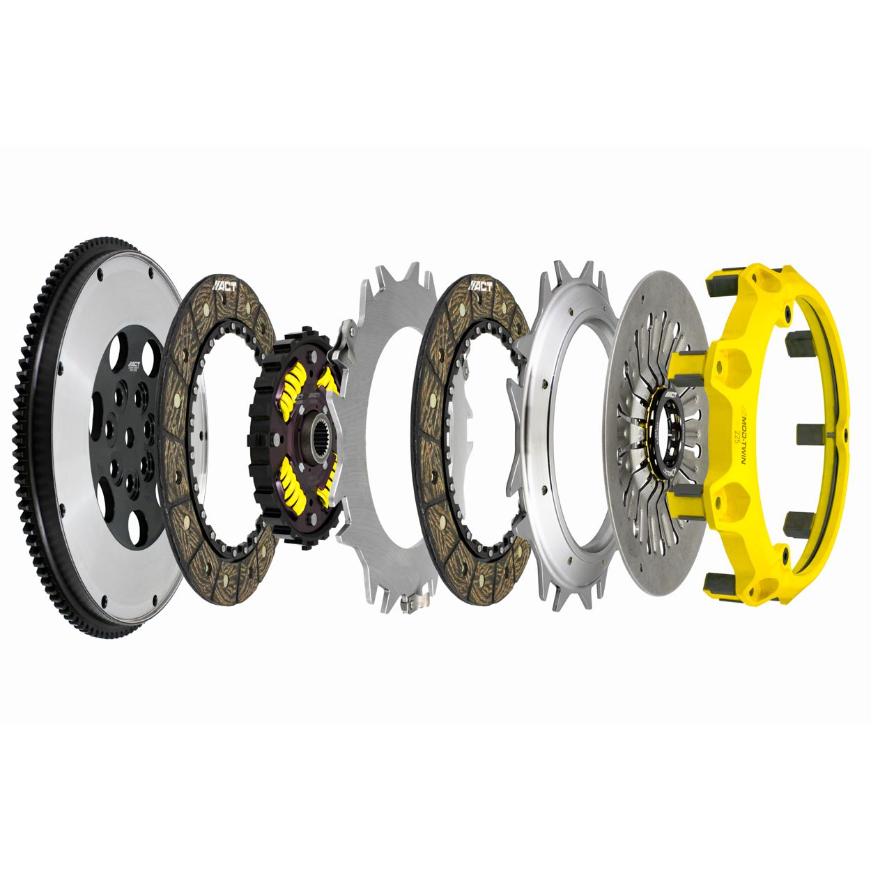 T1R-M01 Mod-Twin 225 HD Sprung Race Kit performs aggressive launches and smoother shifting in high powered AWD’s by combining twice the ceramic friction surfaces with an ultra-durable Mono-Drive sprung hub assembly in a completely modular design. Each diaphragm spring endures an exclusive four-stage heat treating process providing a consistent light pedal feel. Puck-style Friction Plates with high quality ceramic friction materials deliver high friction coefficient, superior heat capacity, and long clutch life. These Friction Plates uniformly transfer torque to a Mono-Drive sprung hub assembly which extends input shaft life and reduces driveline shock from torsional vibration. This kit includes a CNC-machined and dynamically balanced flywheel, pressure plate cover, diaphragm spring, face, puck-style ceramic friction plates, sprung Mono-Drive hub assembly, floater, patented Monoloc Collar, release bearing, alignment tool and pilot bearing (if needed). Mod-Twin clutches are fully rebuildable and most components can be ordered separately.