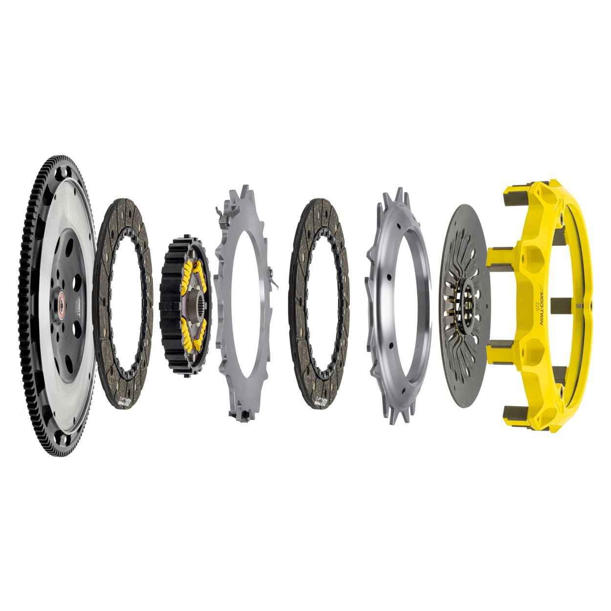 T1S-S05 Mod-Twin 225 HD Sprung Street Kit is designed for high powered AWD street cars. It unites uncompromised pedal feel, durability, engagement quality with very high torque capacity by combining twice the organic friction surfaces with an ultra-durable spring center Mono-Drive hub in a completely modular design. Each diaphragm spring endures an exclusive four-stage heat treating process providing a consistent light pedal feel. Steel-backed Friction Plates with high quality organic friction materials deliver stable friction coefficient, good heat capacity and long clutch life. These Friction Plates uniformly transfer torque to the Mono-Drive sprung hub assembly which extends input shaft life and reduces driveline shock from torsional vibration. This kit includes a CNC-machined and dynamically balanced flywheel, pressure plate cover, diaphragm spring, face, puck-style ceramic friction plates, sprung Mono-Drive hub assembly, floater, patented Monoloc Collar, release bearing, alignment tool and pilot bearing (if needed). Mod-Twin clutches are fully rebuildable and most components can be ordered separately.