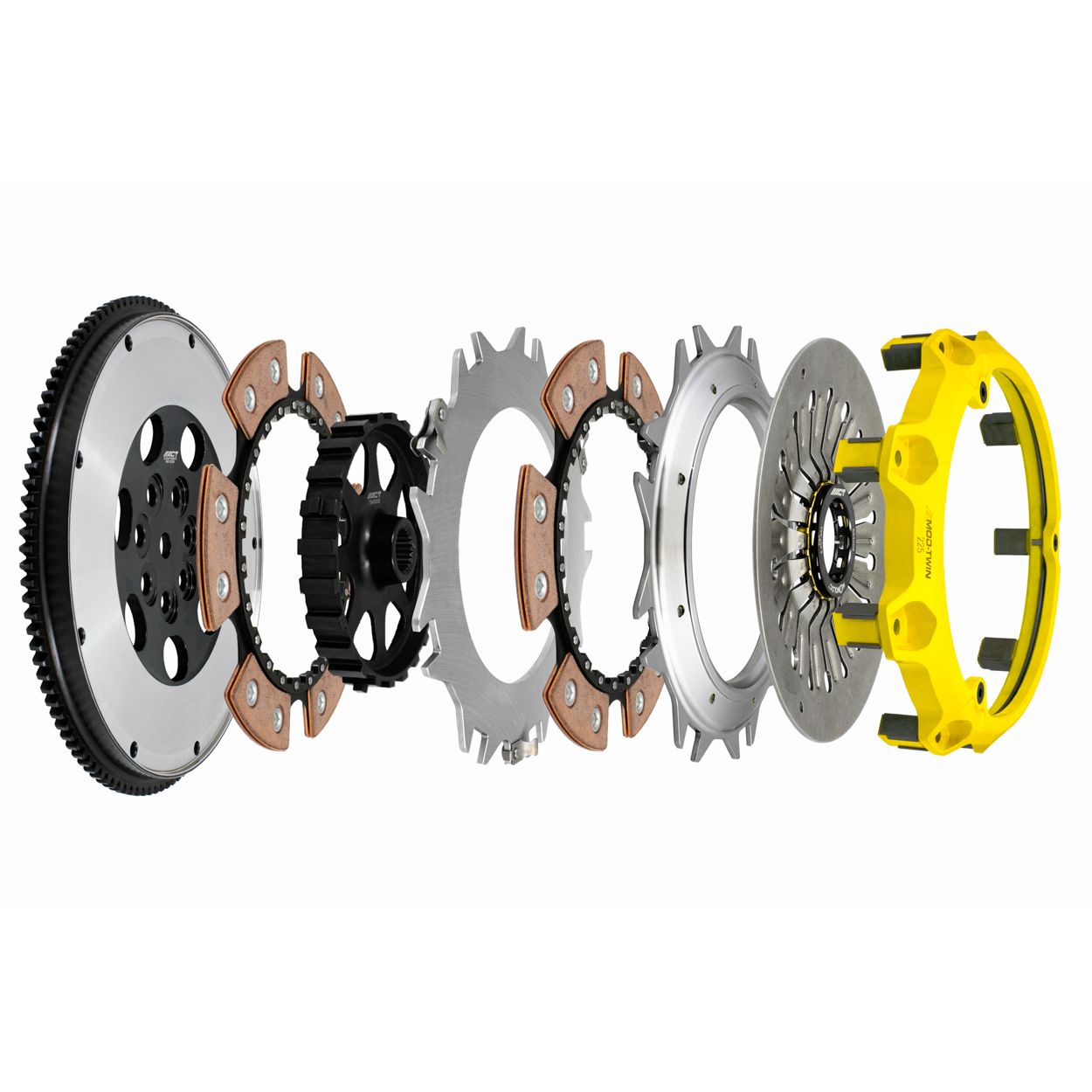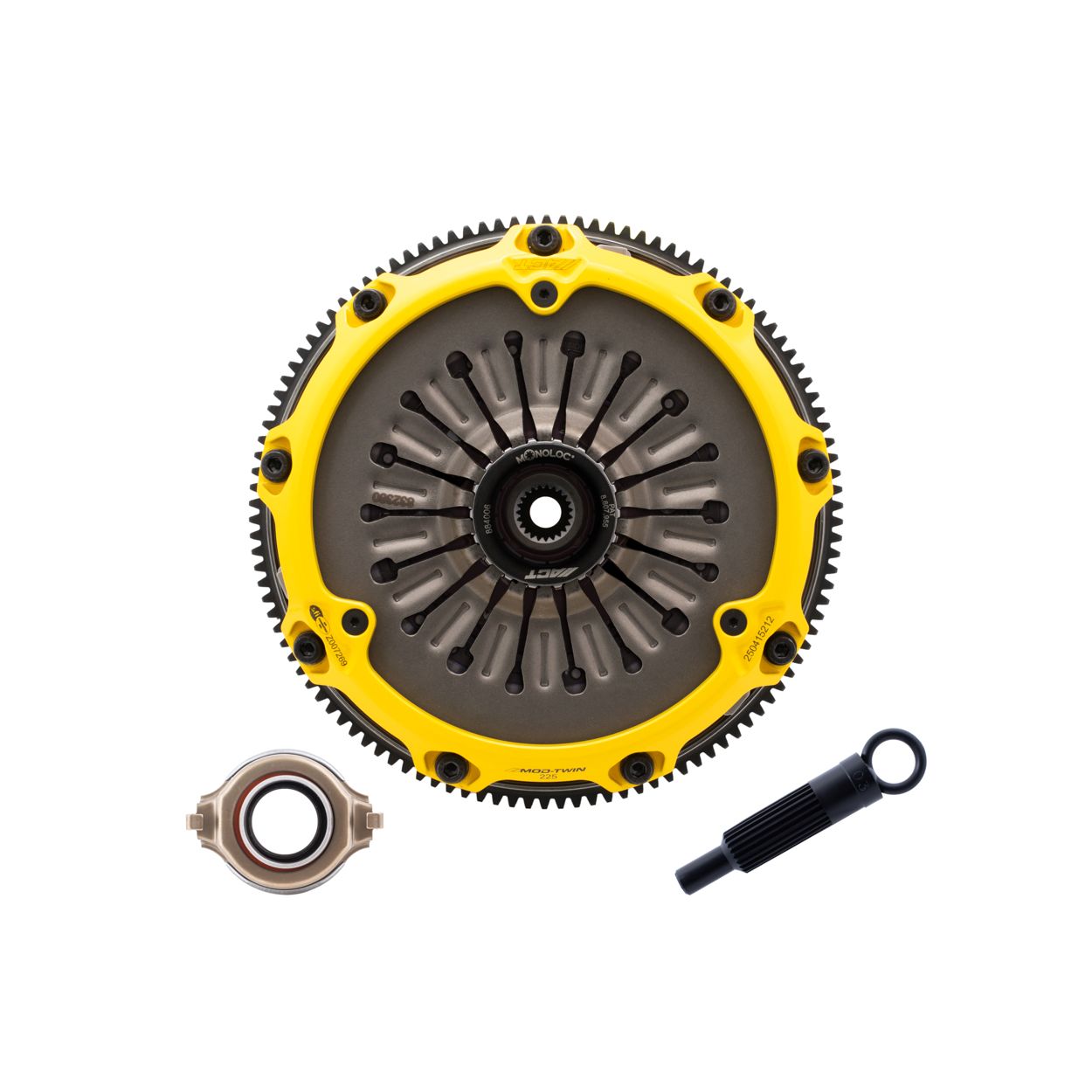 T2R-M03 Mod-Twin 225 XT Rigid Race Kit tackles aggressive launches and rapid shifting of high powered AWD’s by combining twice the ceramic friction surfaces with a no-nonsense solid Mono-Drive hub in a completely modular design. Each diaphragm spring endures an exclusive four-stage heat treating process providing a consistent light pedal feel. Puck-style Friction Plates with high quality ceramic friction materials deliver high friction coefficient, superior heat capacity, and long clutch life. These Friction Plates uniformly transfer torque to a Mono-Drive chrome-moly hub which is heat treated for strength and durability extending input shaft life with one continuous spline. The lightweight, rigid design allows for quicker shifts and trouble-free service. This kit includes a CNC-machined and dynamically balanced flywheel, pressure plate cover, diaphragm spring, face, puck-style ceramic friction plates, rigid Mono-Drive hub, floater, patented Monoloc Collar, release bearing, alignment tool and pilot bearing (if needed). Mod-Twin clutches are fully rebuildable and most components can be ordered separately.